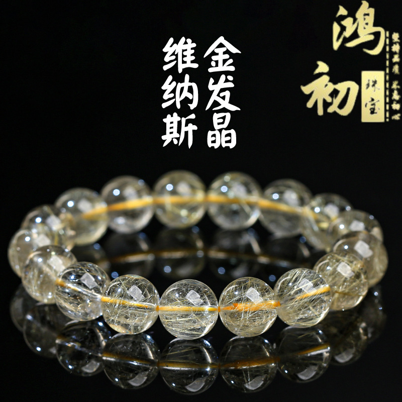 鸿初水晶 天然维纳斯金发晶圆珠手串 冰种维纳斯金发晶手链批发