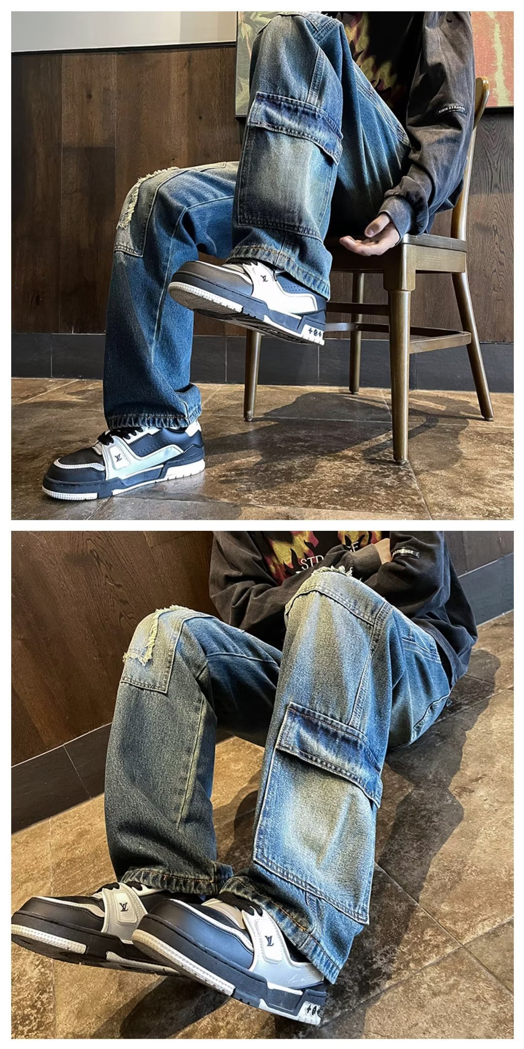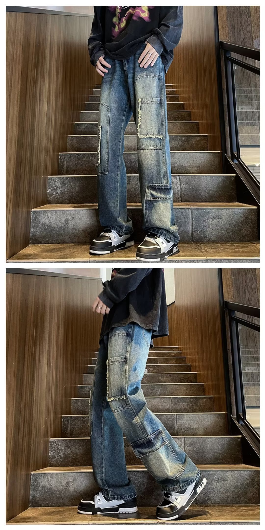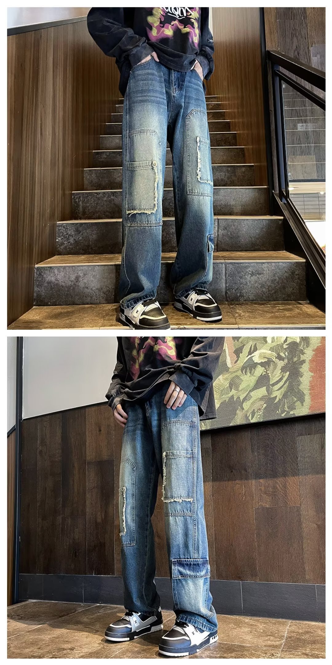アメリカの高街のレトロな水洗いの毛の縁の多いポケットのまっすぐな筒のジーパンの小さい大衆の設計感の湿っているゆったりしているカジュアルなズボン