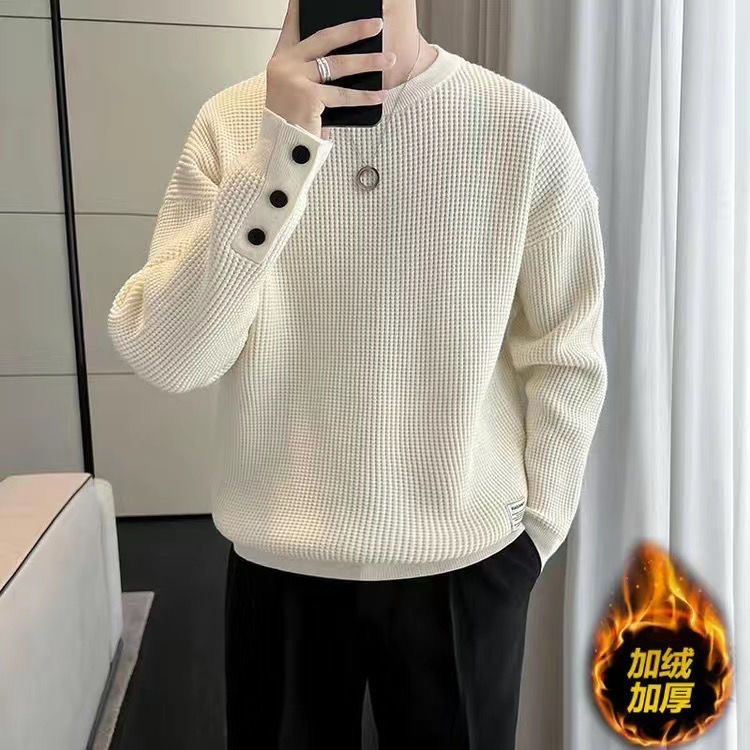 ワッフルのガードルとベルベットの厚い丸首のガードルの男性2024の新しい秋冬のゆるい純色の中に暖かいシャツを着ます