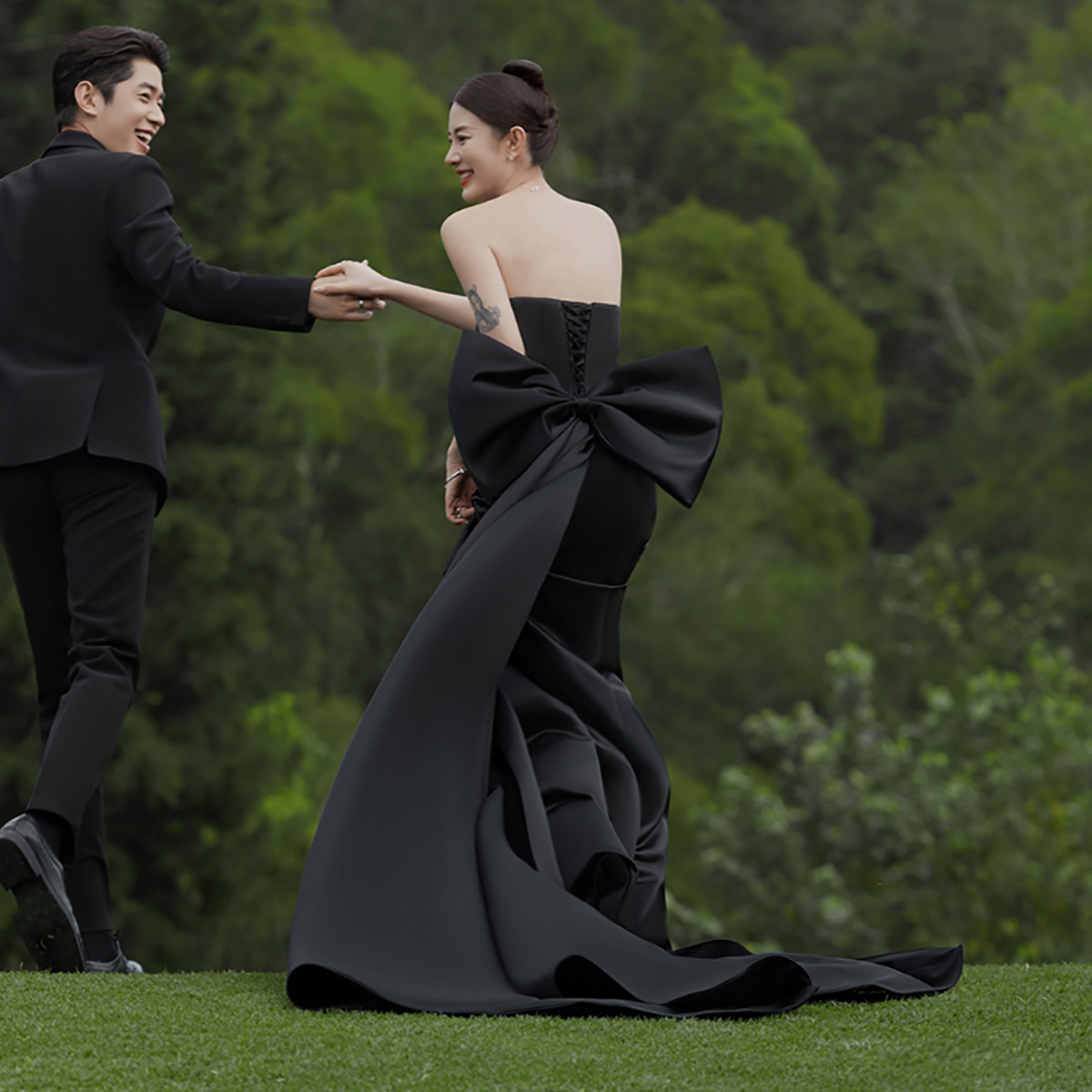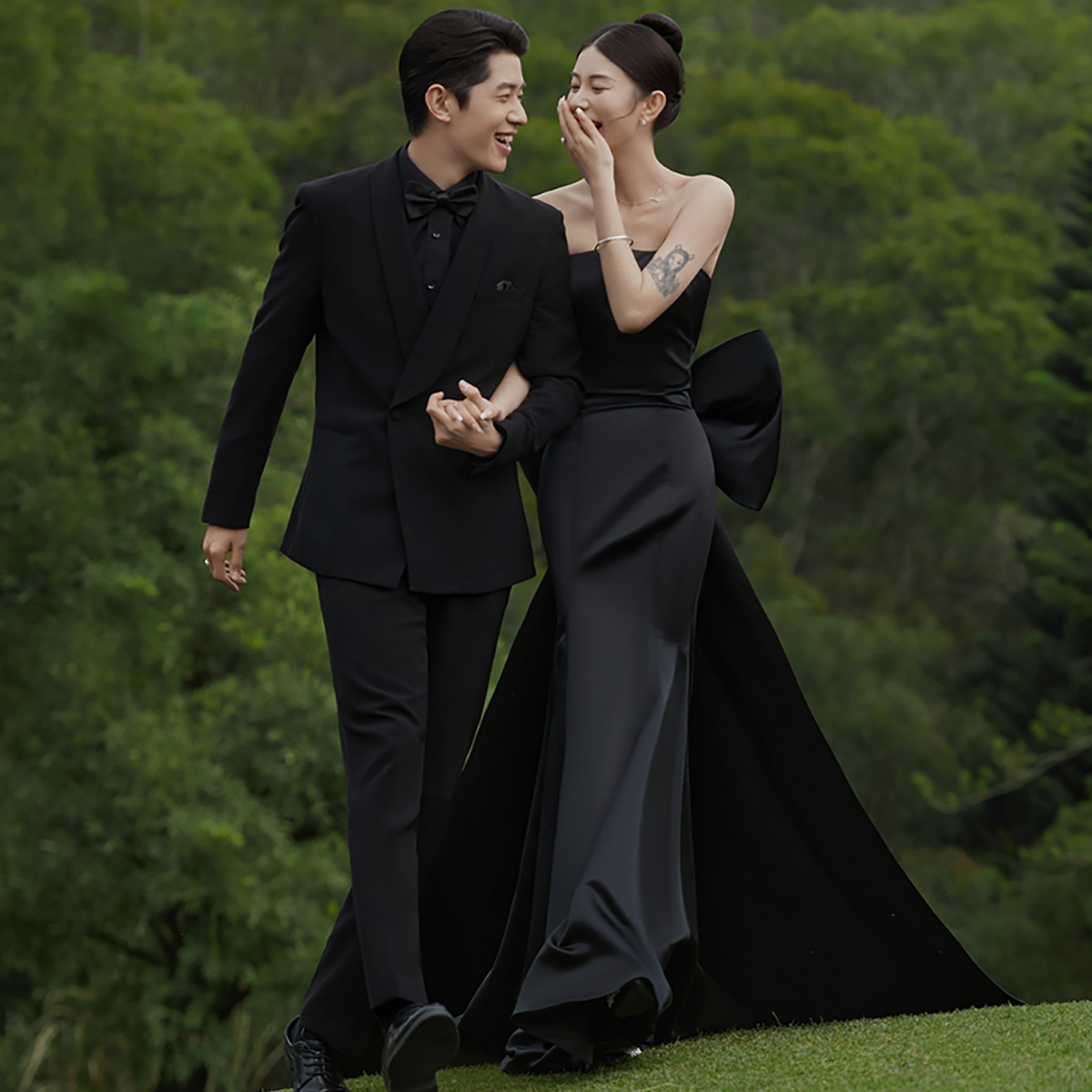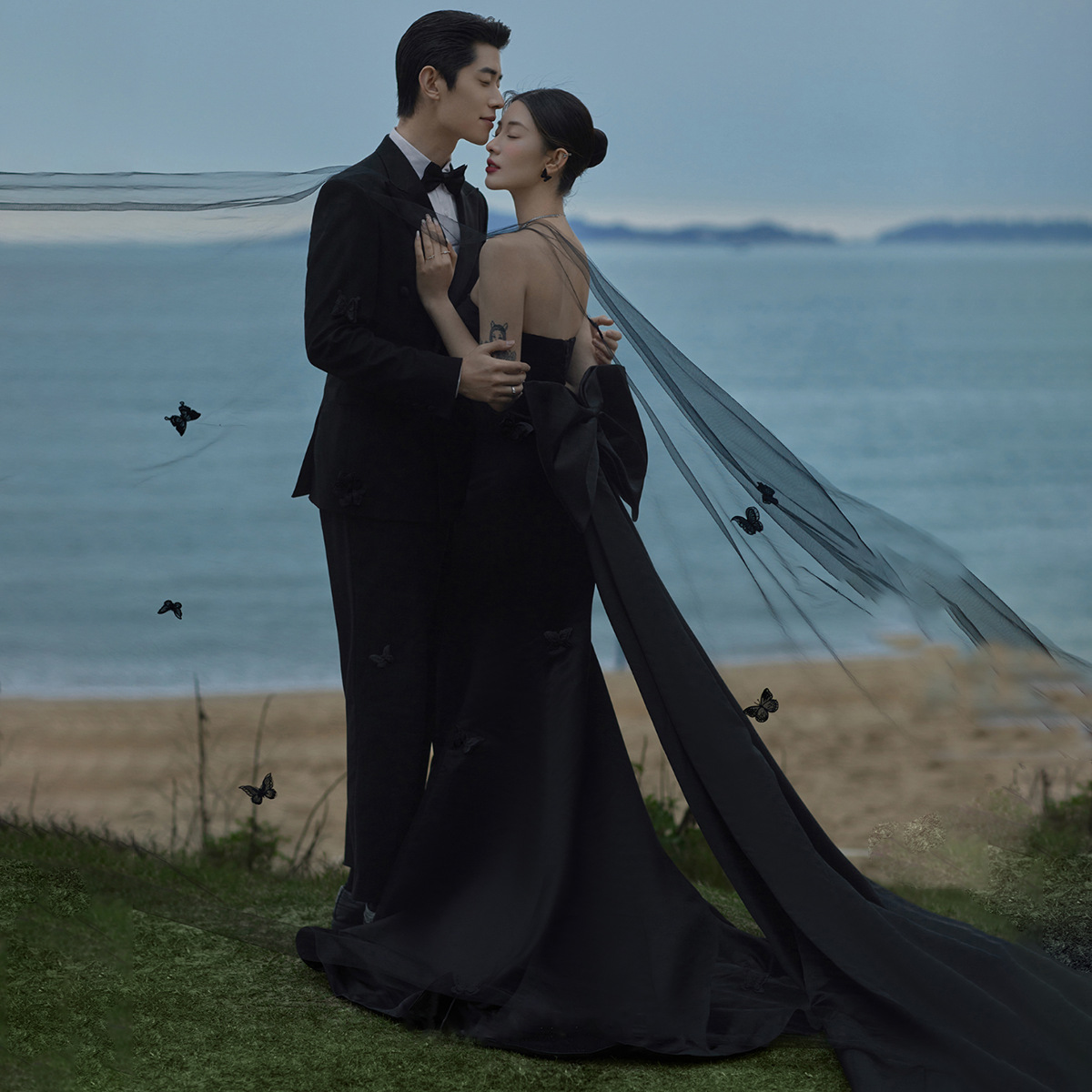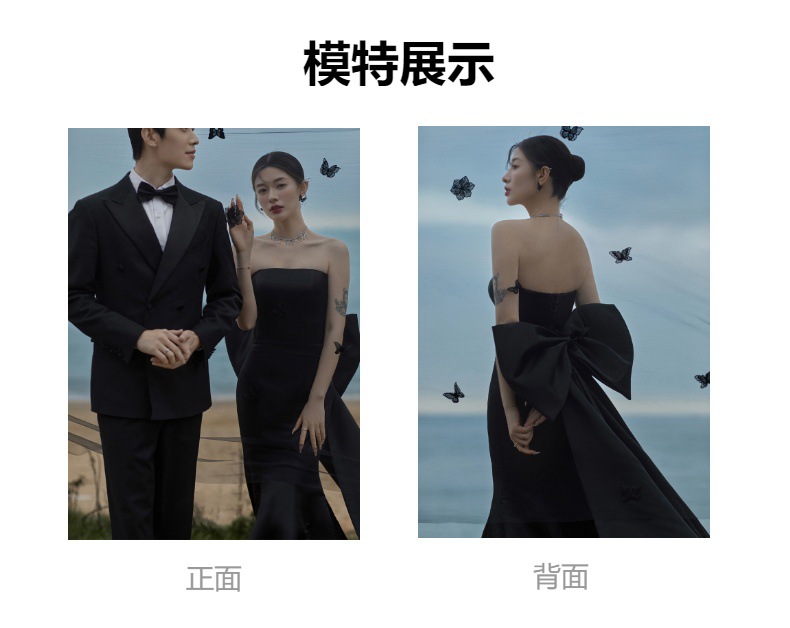 黒の魚の尾の軽いウェディングドレスの蝶結びのヘボン風の蝶結びの尾の影楼のテーマのカップルは写真を撮ります。