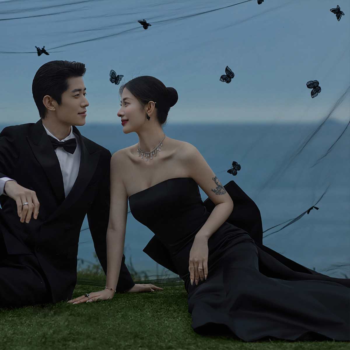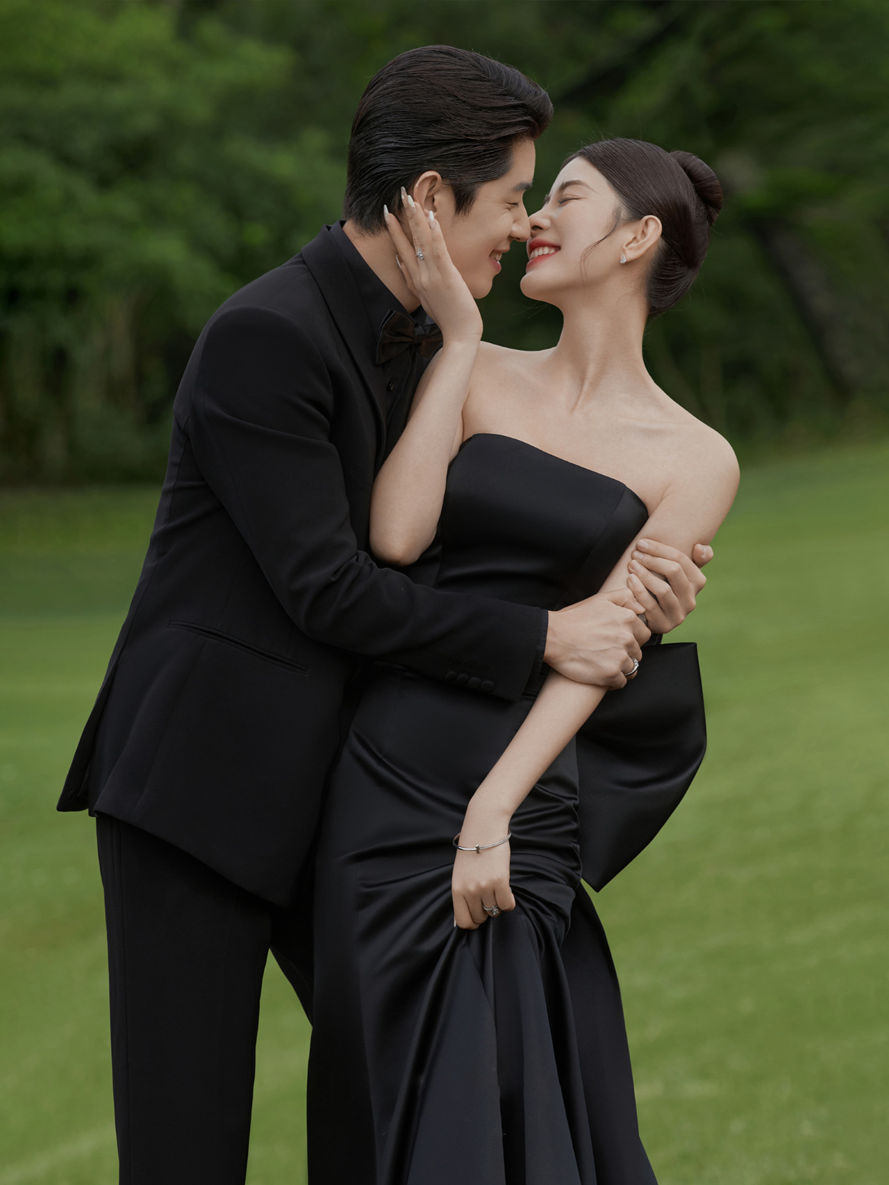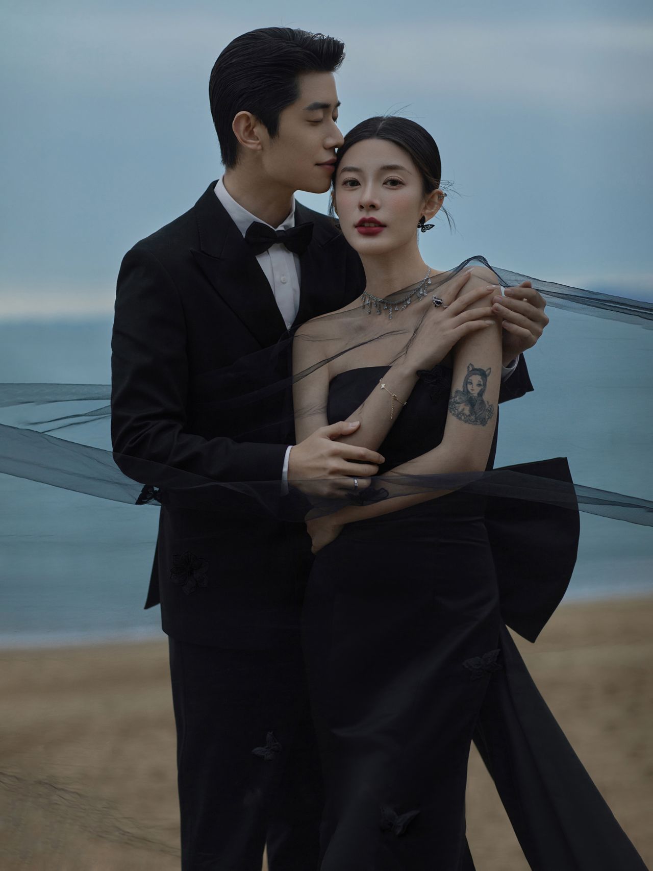 黒の魚の尾の軽いウェディングドレスの蝶結びのヘボン風の蝶結びの尾の影楼のテーマのカップルは写真を撮ります。