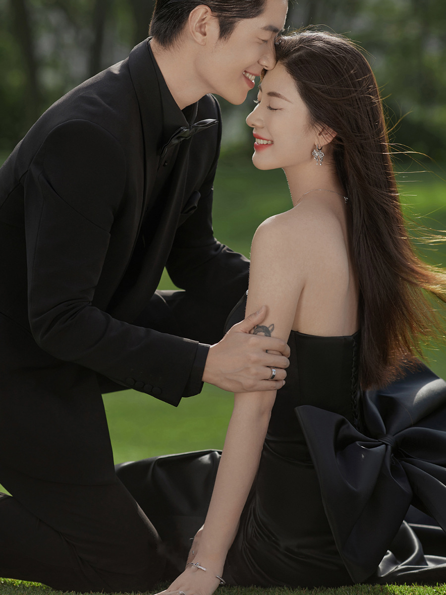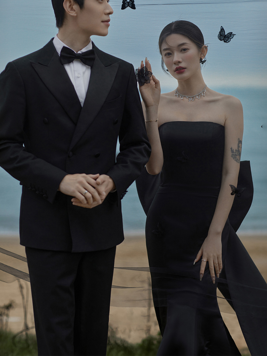 フランス式の軽いウェディングドレスの黒いサテンのヘボン風の影楼のテーマのカップルの写真の蝶結びの領収書の登録の小さいドレス
