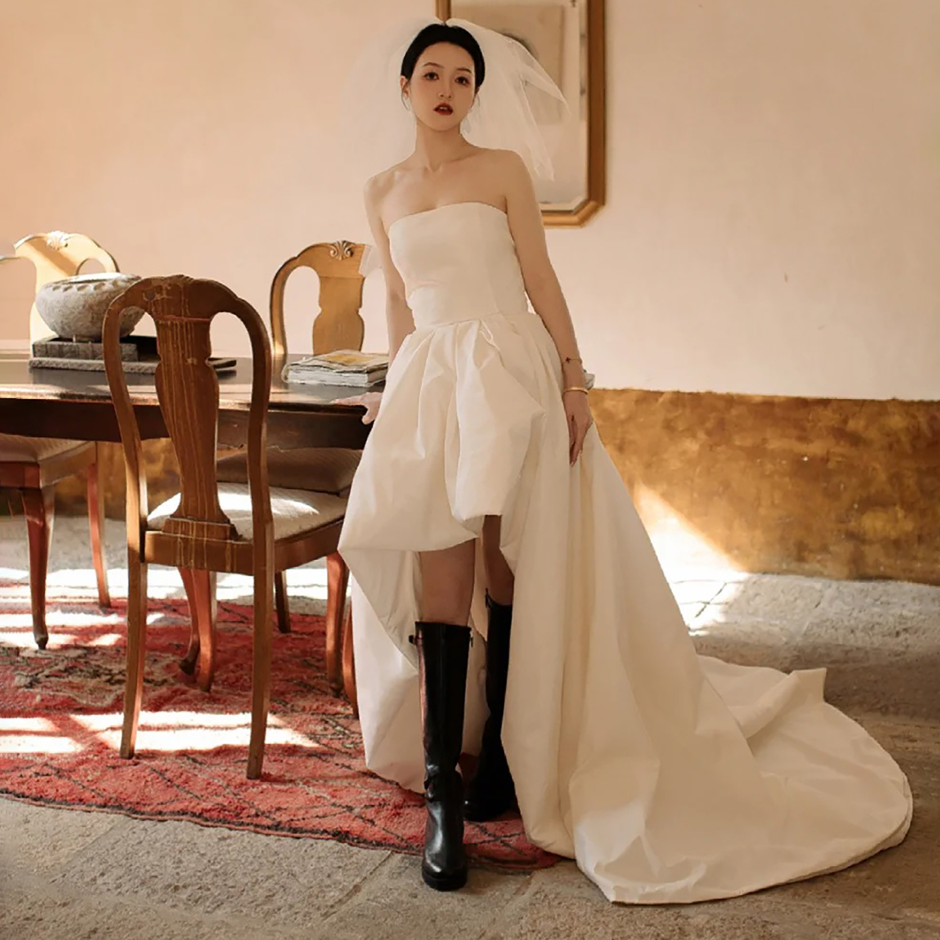 法式轻婚纱塔夫绸抹胸前短后长简约大气旅拍超仙蓬蓬裙绝美高级感