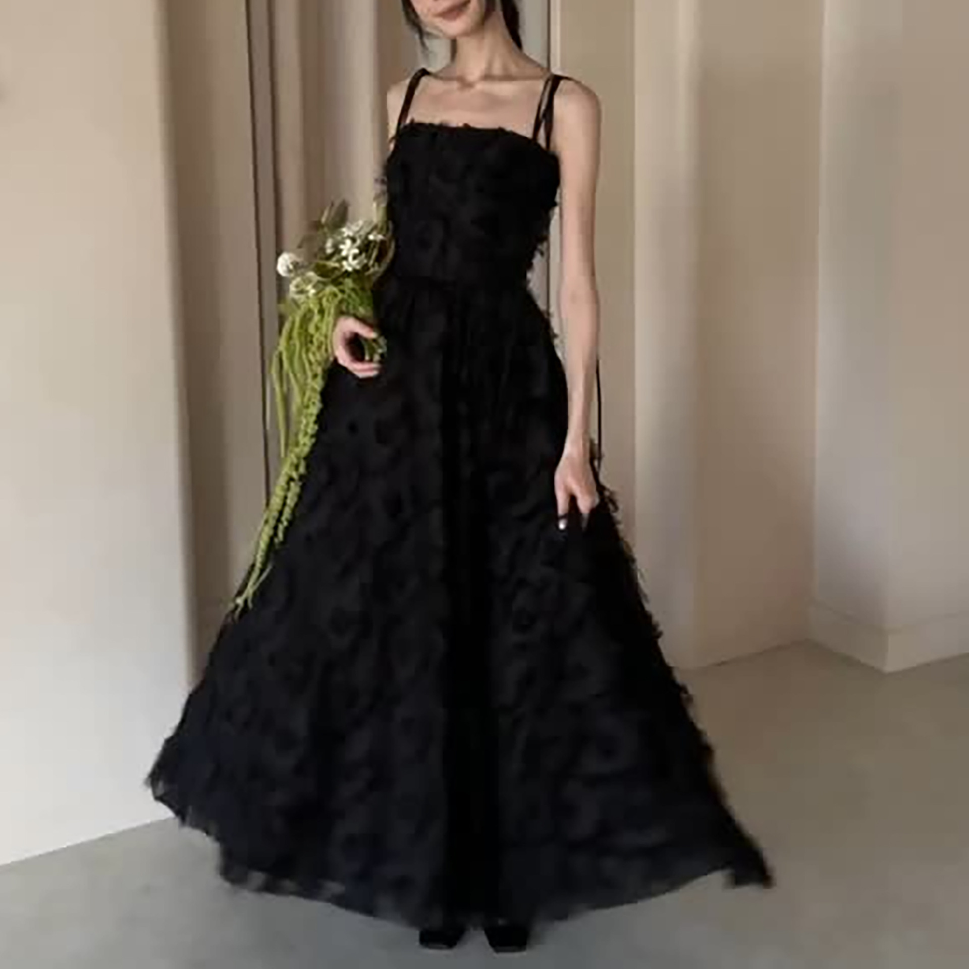 イブニングドレス 2025 スーパーフェアリーフェザー誕生日黒のセクシーなドレスサスペンダー黒宴会気質ドレス女性