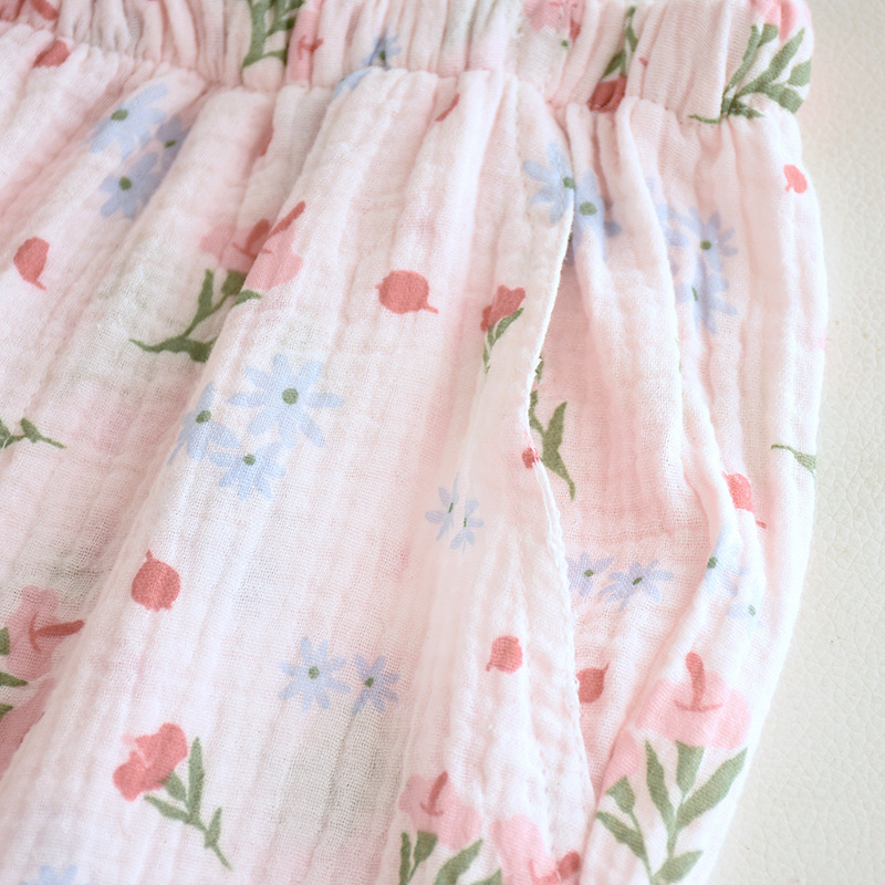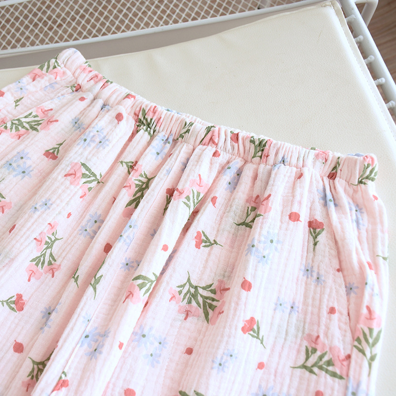 クラス A 純綿ガーゼパジャマ女性のショーツ夏の新しい綿ポケット薄い二層クレープ 3 点ホームパンツ