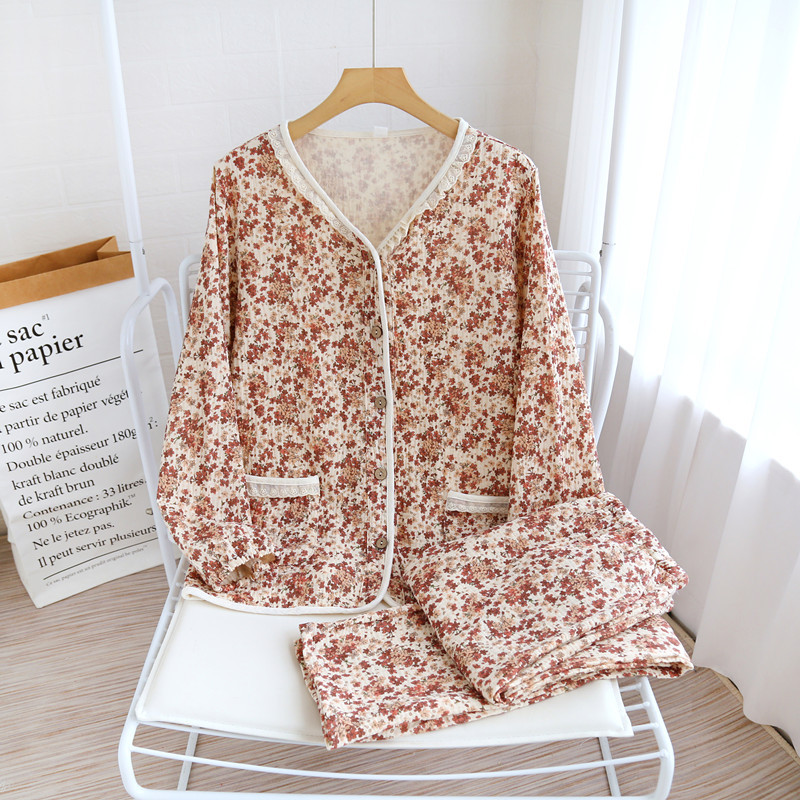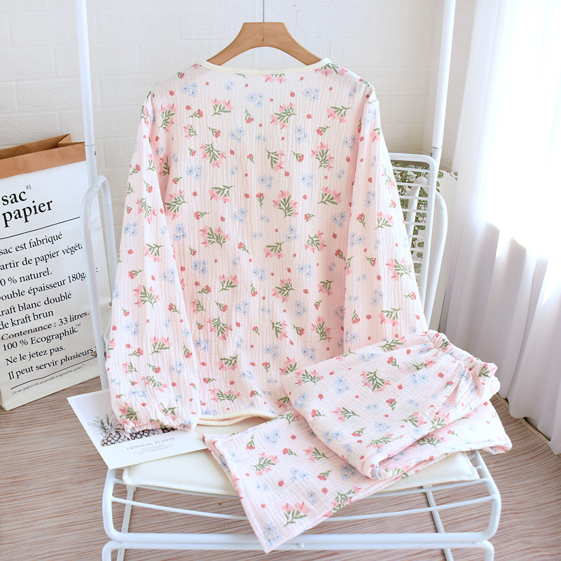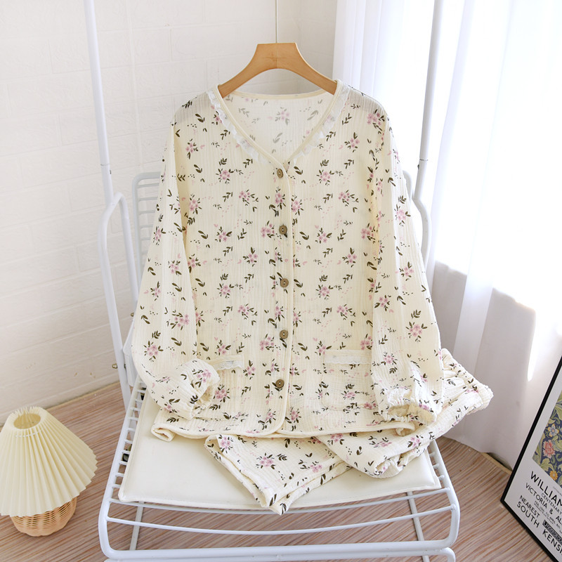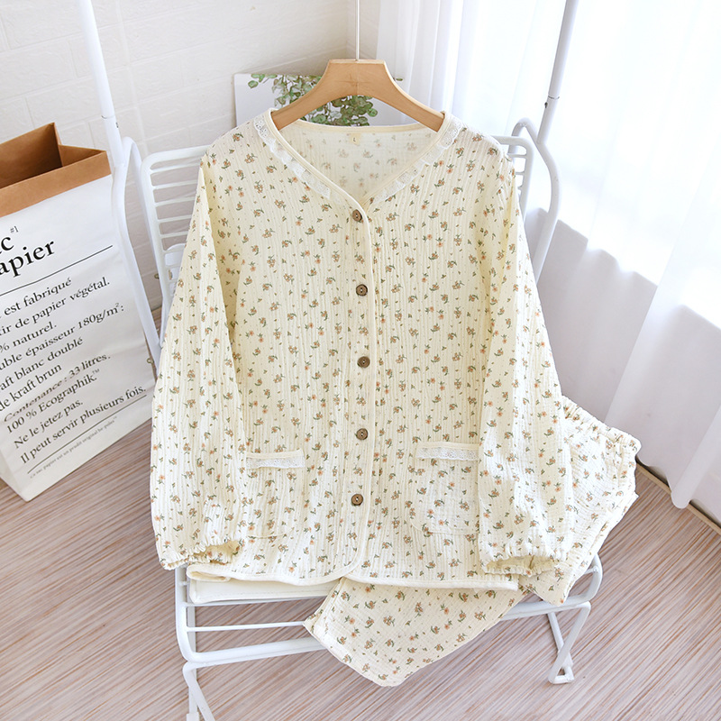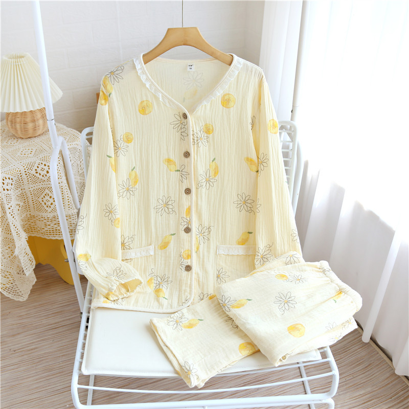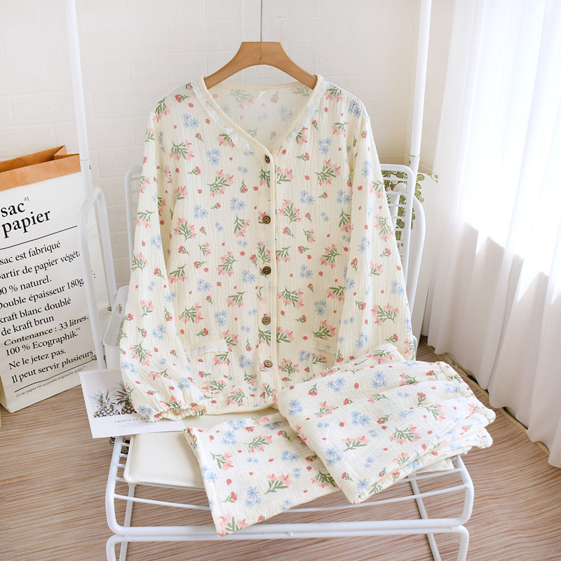 新しいパジャマの女性綿のガーゼの2層のクレープの薄い長袖の春と秋の夏の綿のカーディガンの部屋の服のスーツ