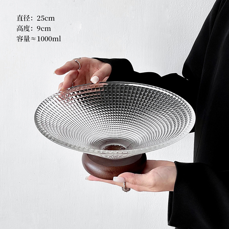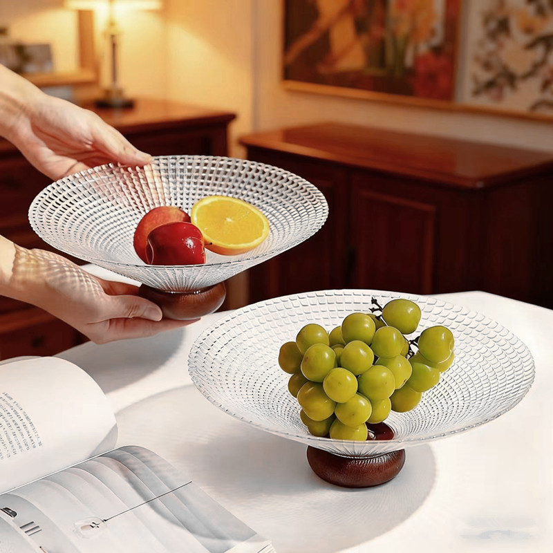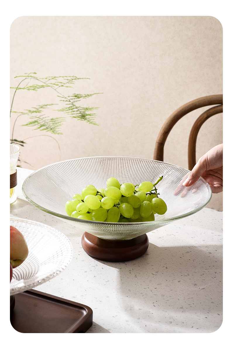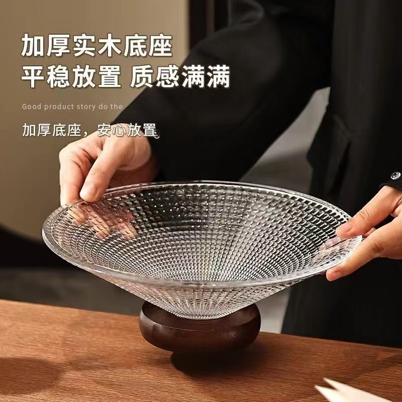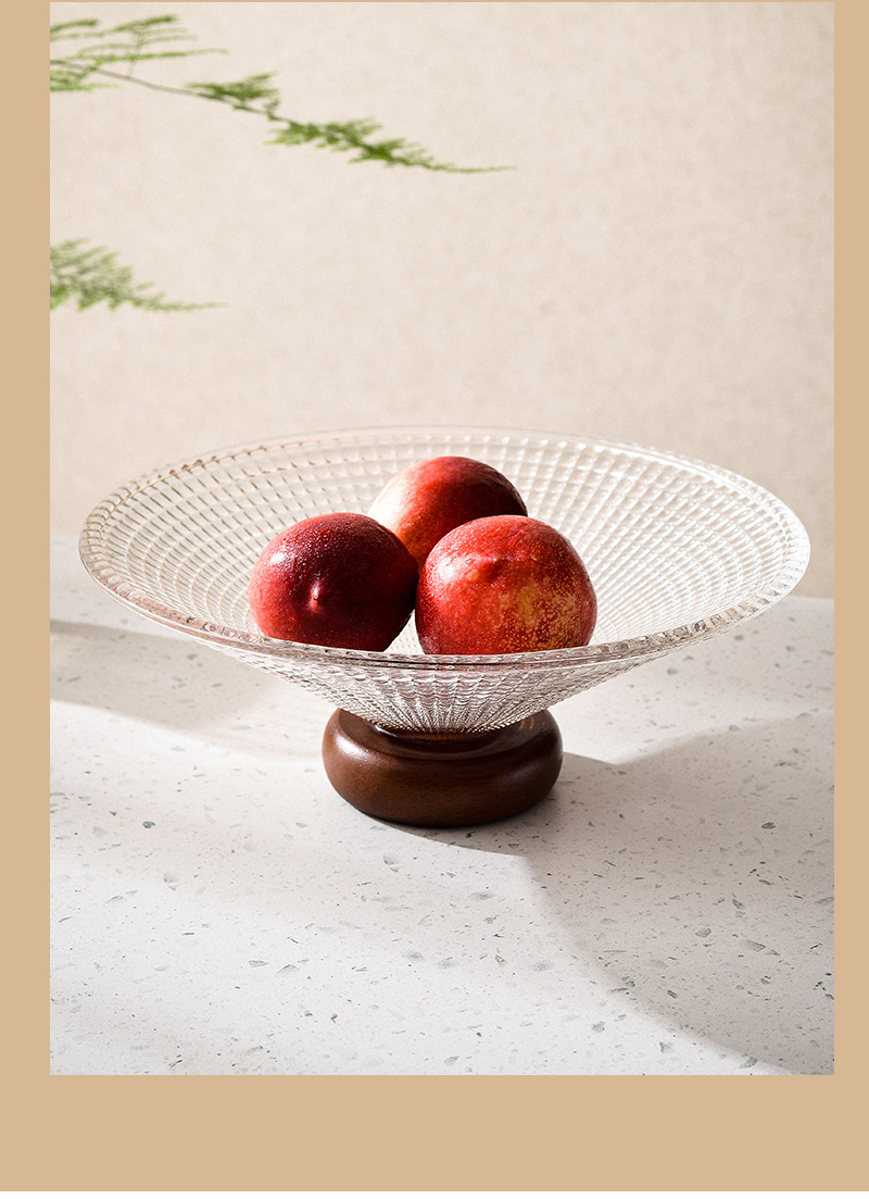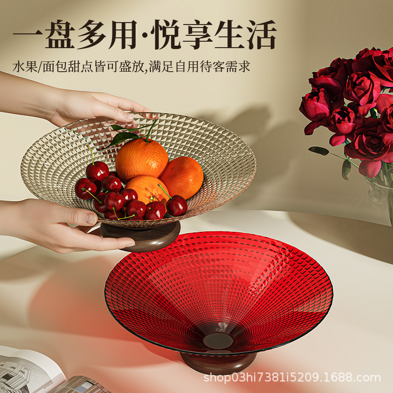 欢乐淘家用客厅水果盘轻奢下午茶玻璃零食盘橡胶木高脚点心糖果盘