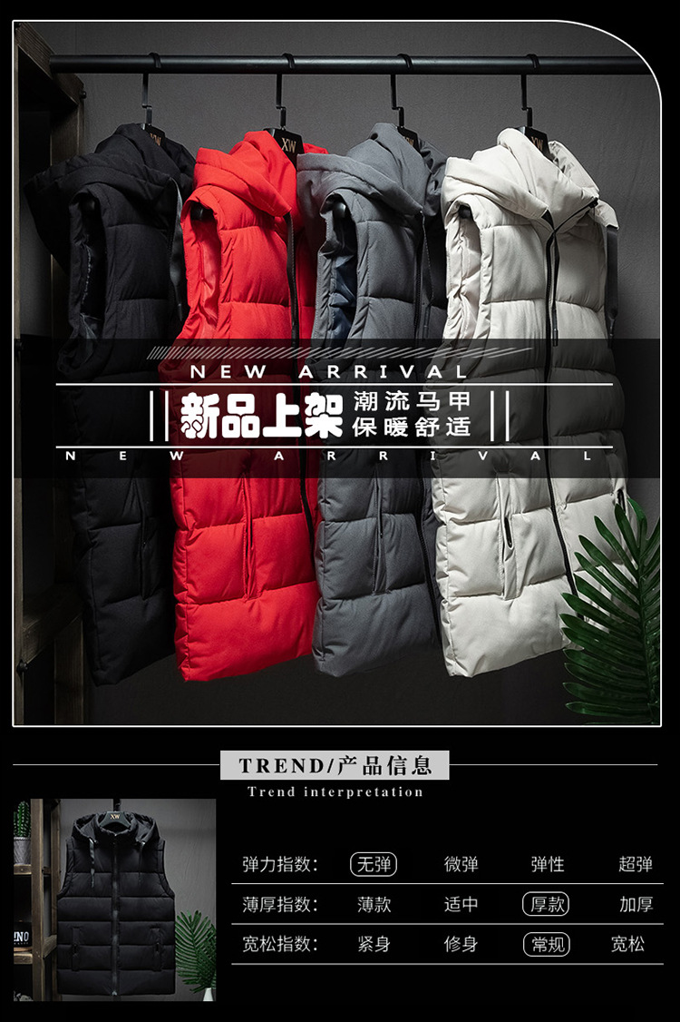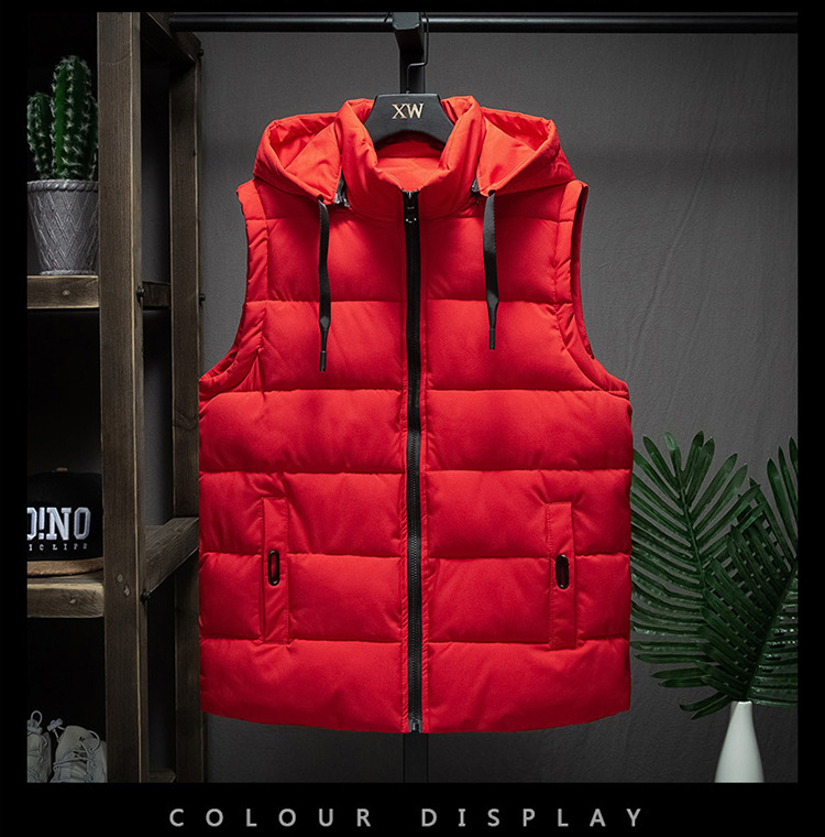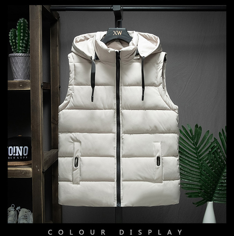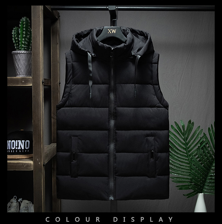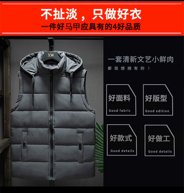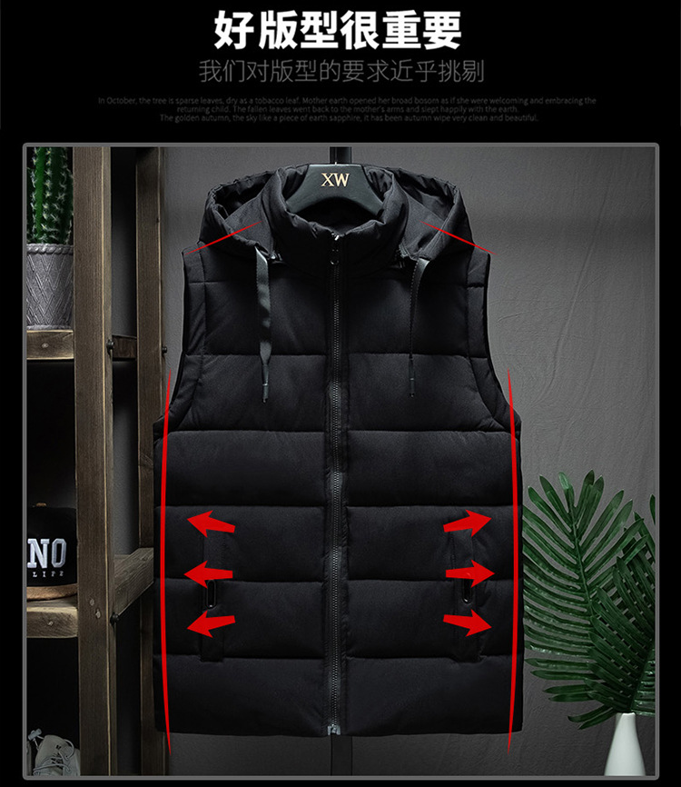 メンズベストコート、綿入りベスト、保温ベスト、トレンディなゆったりスタイル、おしゃれでかっこいいフード付きベスト