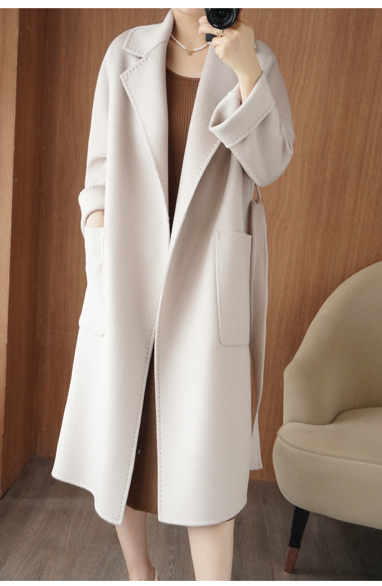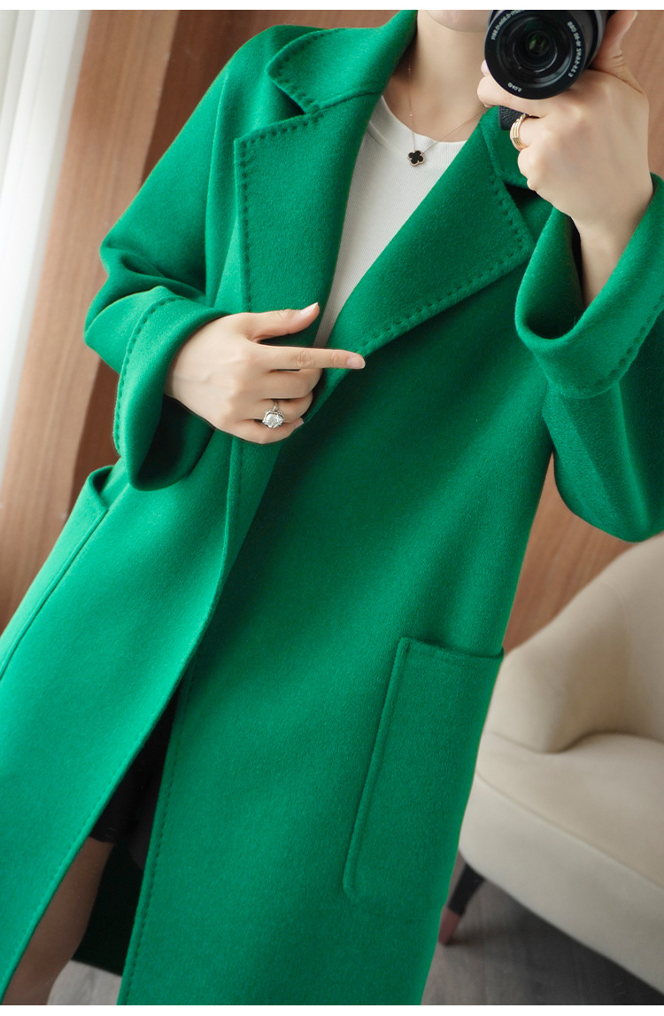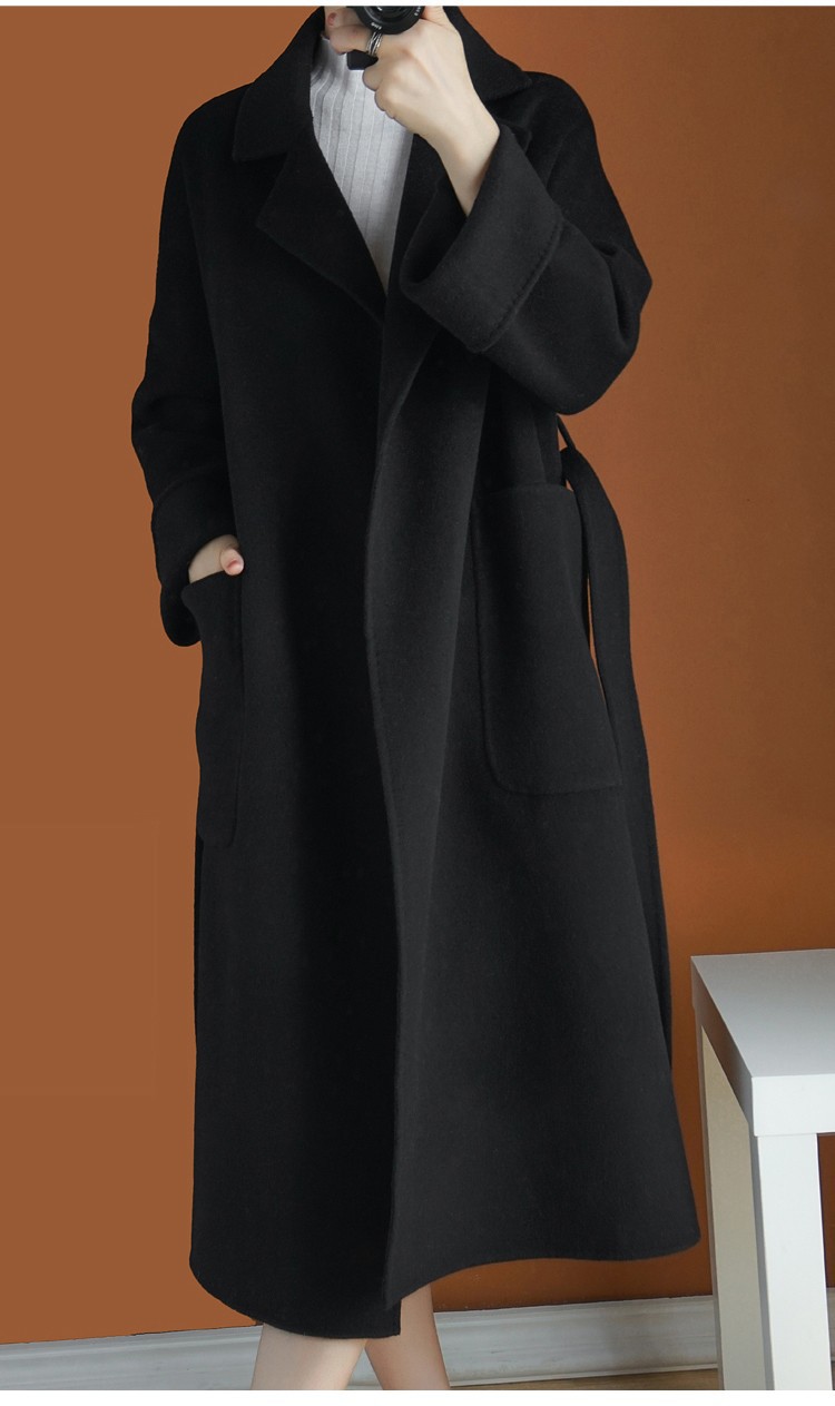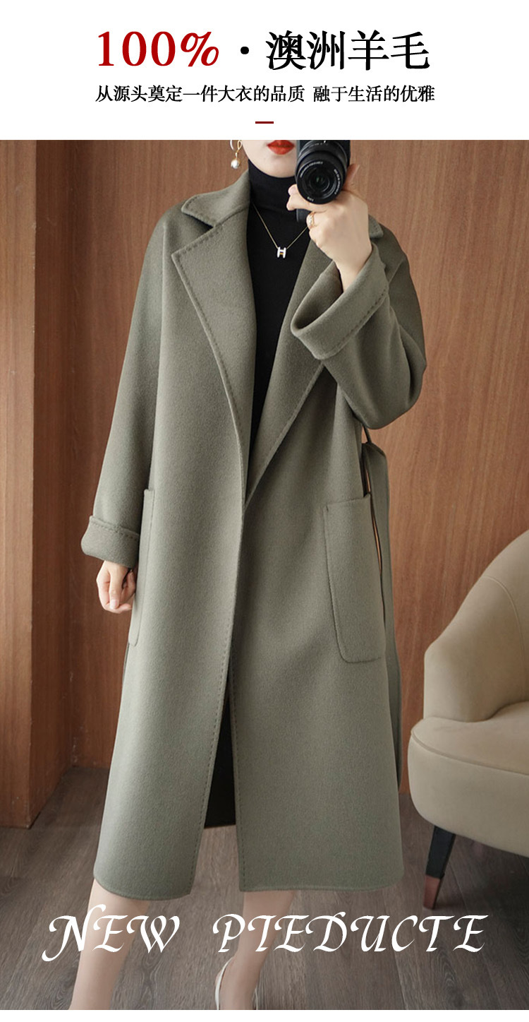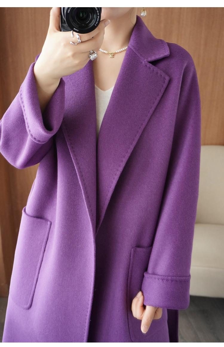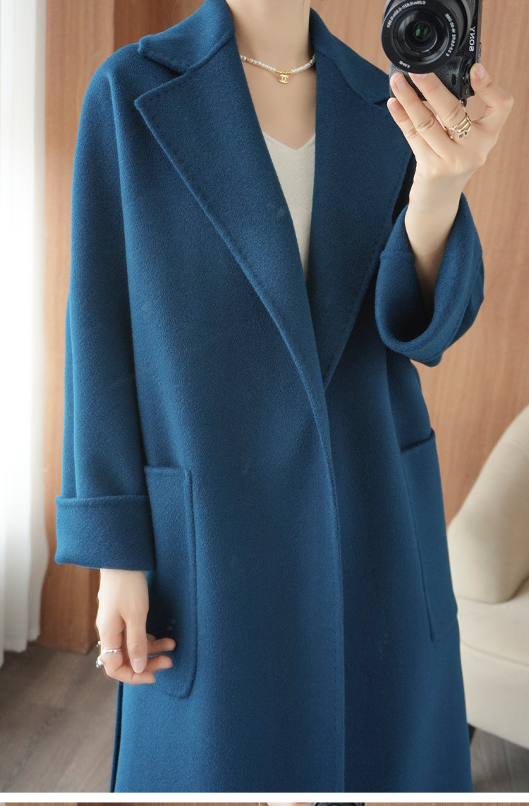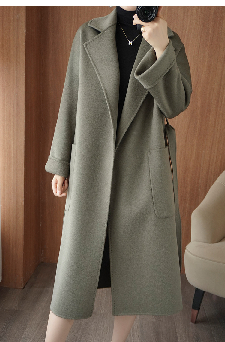 2024ウールの両面ですね。ロングヘアのコートです。女性はゆったりしていて、おしゃれで痩せています。