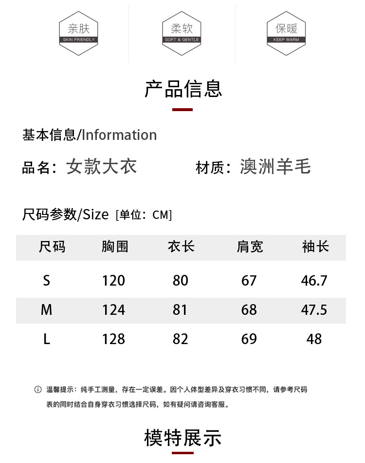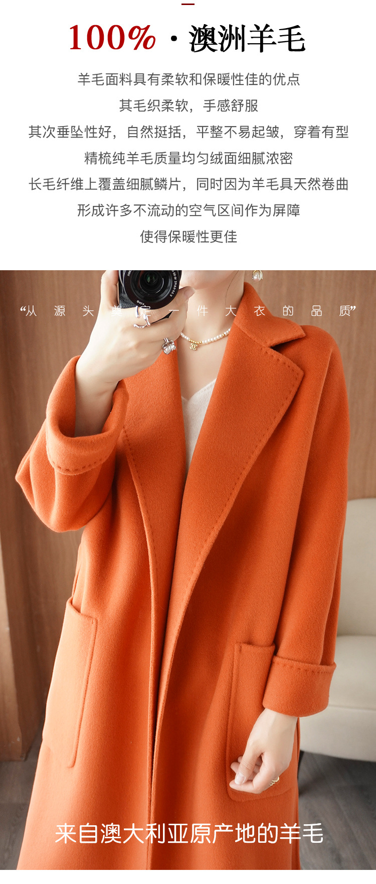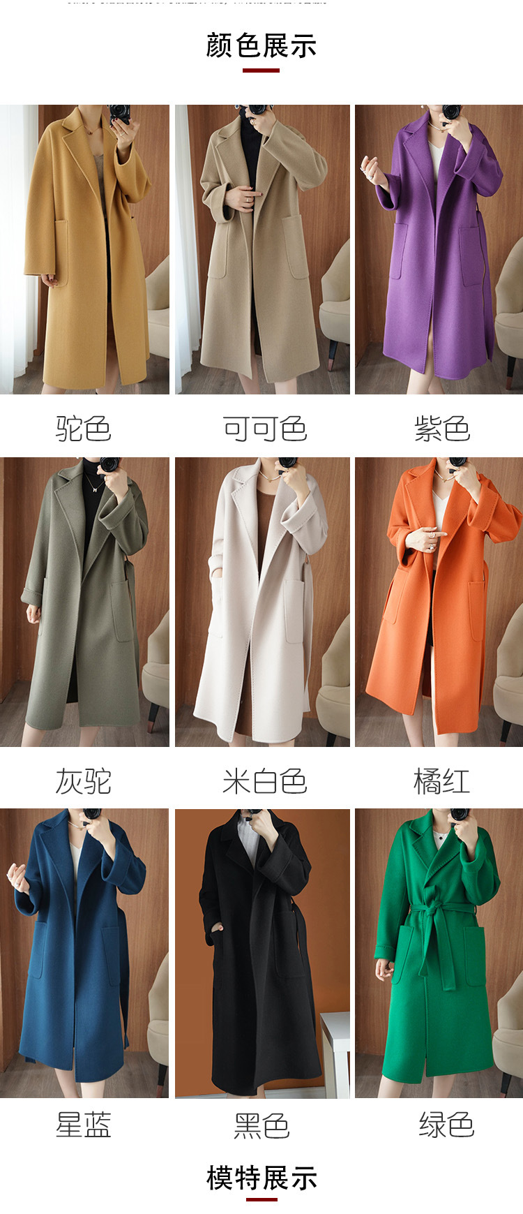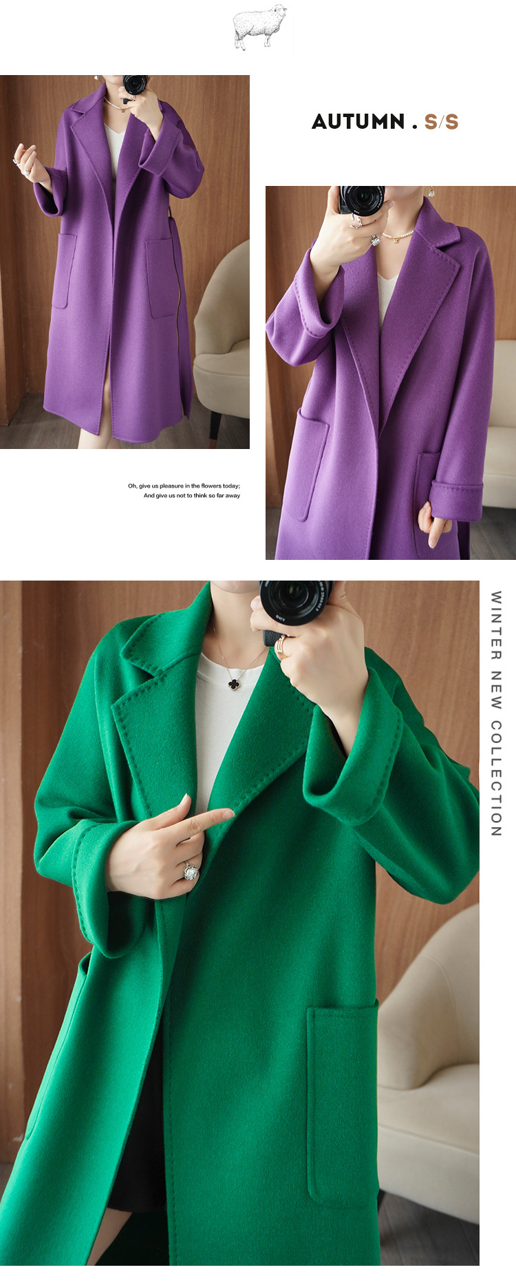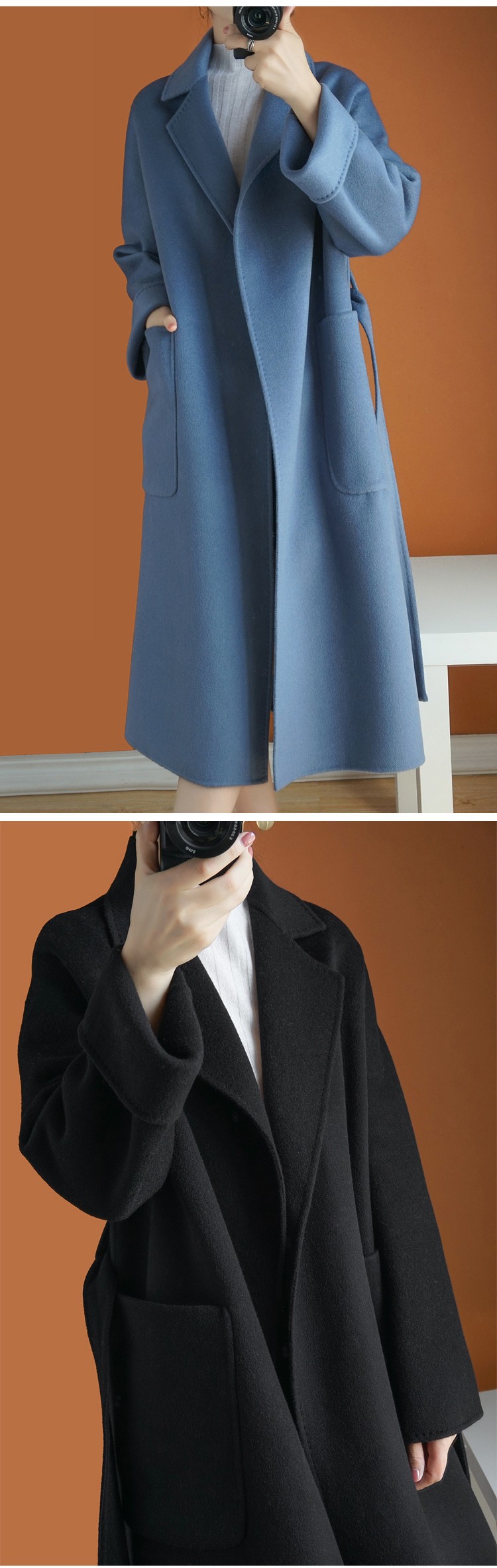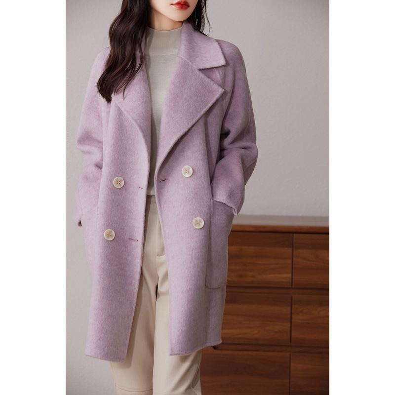 2024ウールの両面ですね。ロングヘアのコートです。女性はゆったりしていて、おしゃれで痩せています。