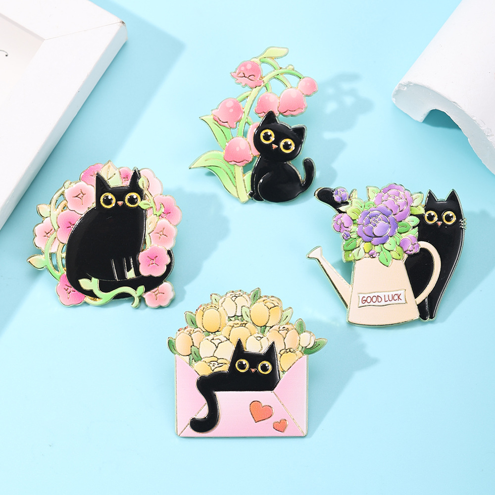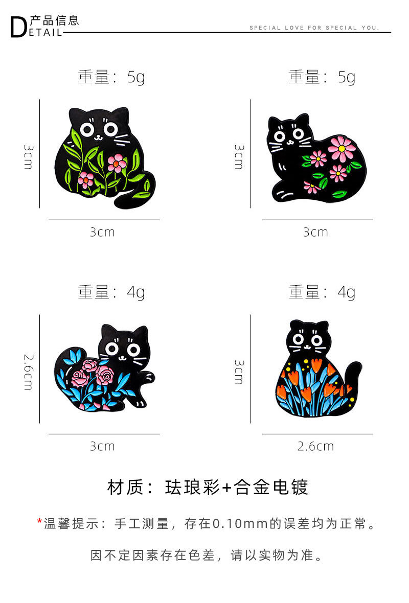 跨境新款猫咪花卉胸针清新可爱浮雕金属徽章新工艺可爱风黑猫徽章