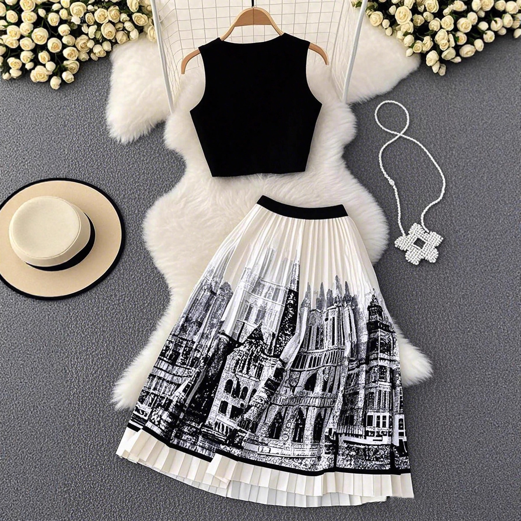 夏季水墨印花无袖长裙套装无袖纯色背心百搭百褶裙两件套