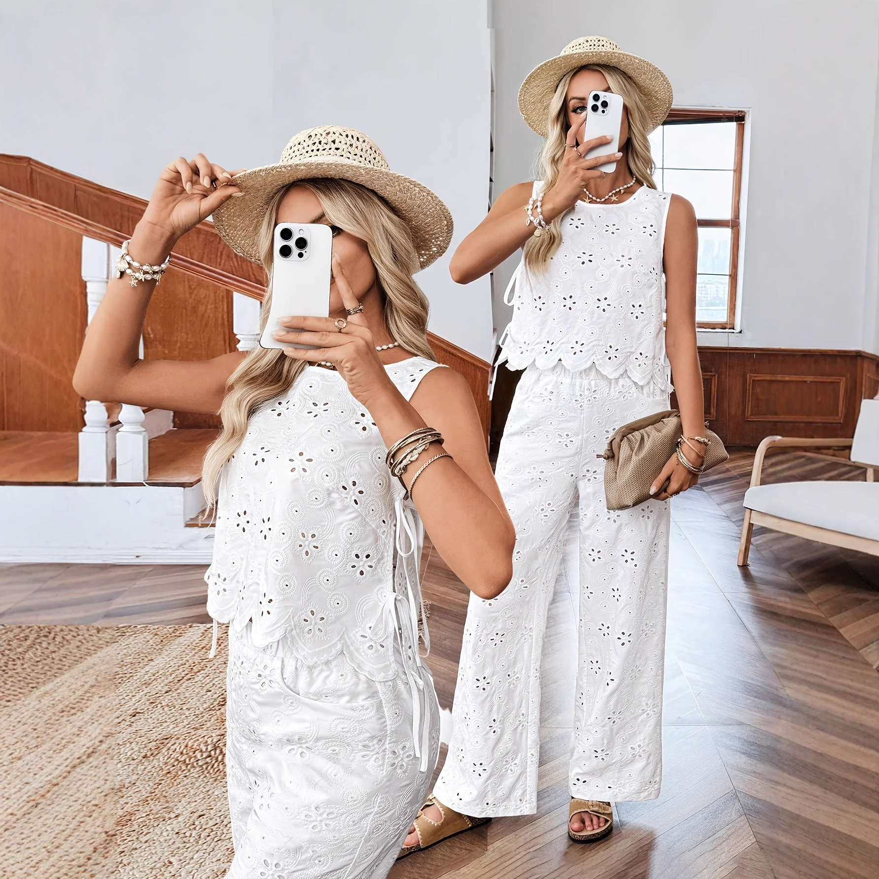 跨境欧美亚马逊外贸 女士休闲刺绣侧系带无袖背心与长裤套装