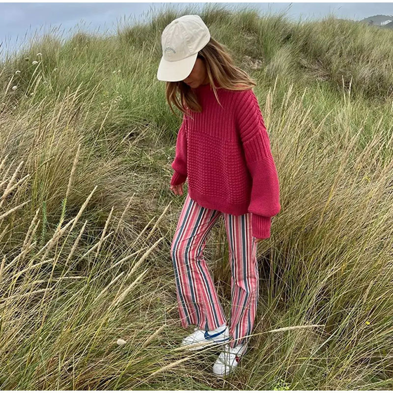 欧米の婦人服秋冬新作気質丸首長袖ストライプセーター2点セットゆったりカジュアル長ズボンセット女性