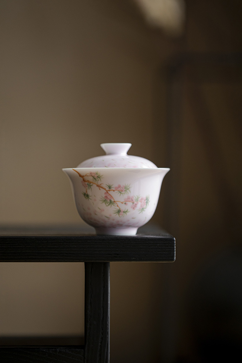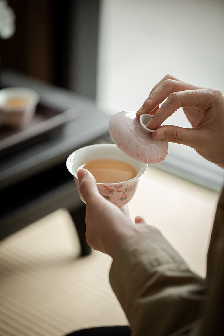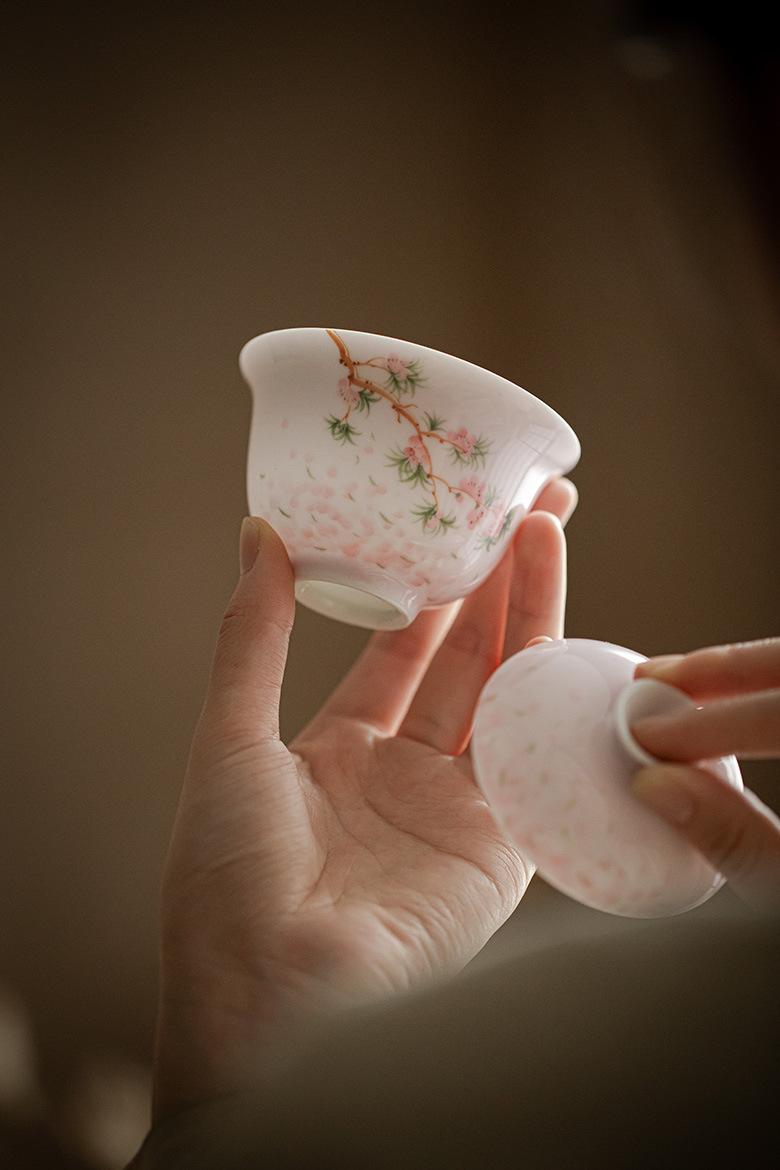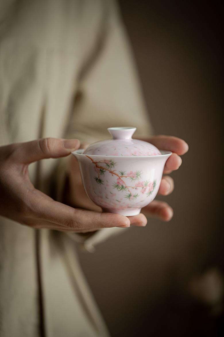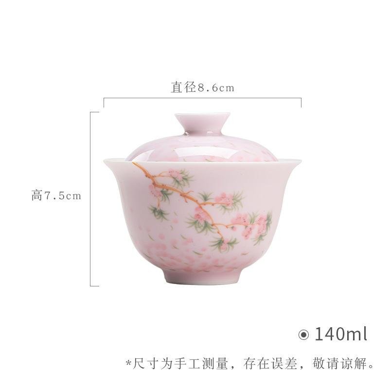 墨己手描き桜日本式蓋碗工夫茶器ぼかしピンクの可愛いお茶碗家庭用玉泥茶蓋碗