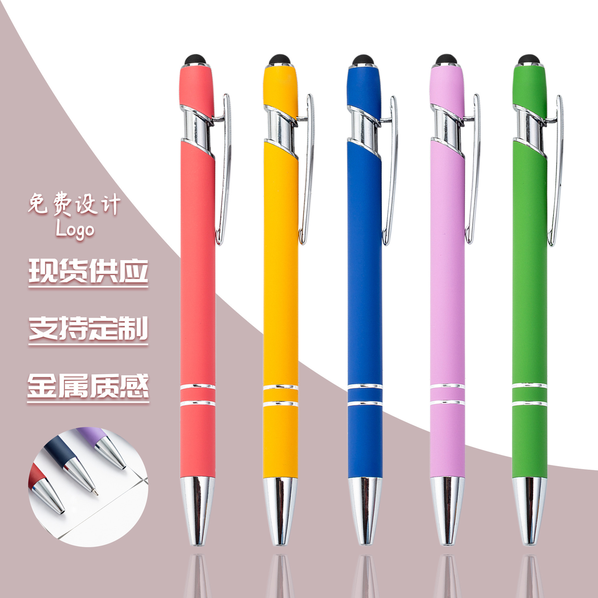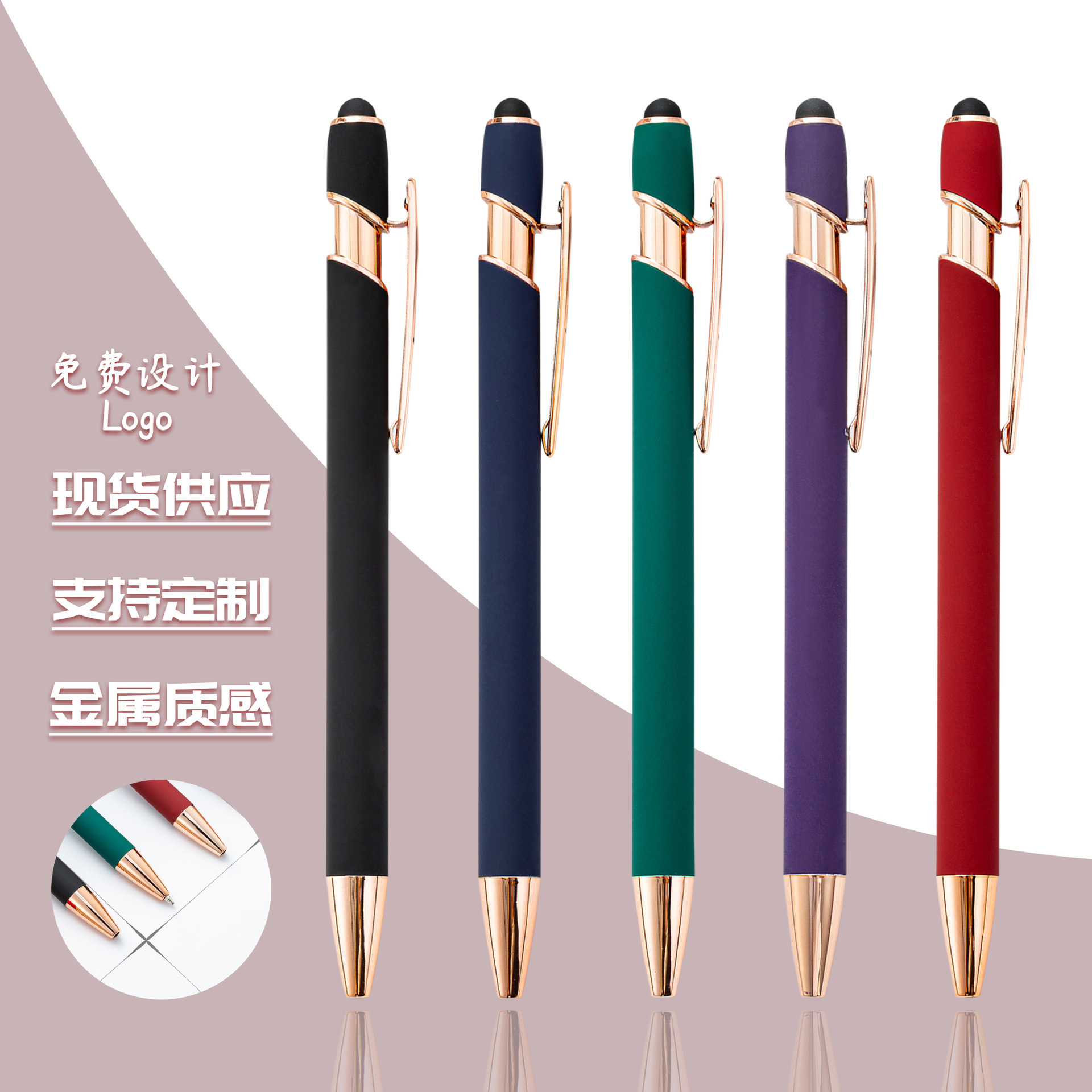 玫瑰金美极按动笔圆珠笔芯铝杆笔喷胶按压笔可印刷logo金属触屏笔