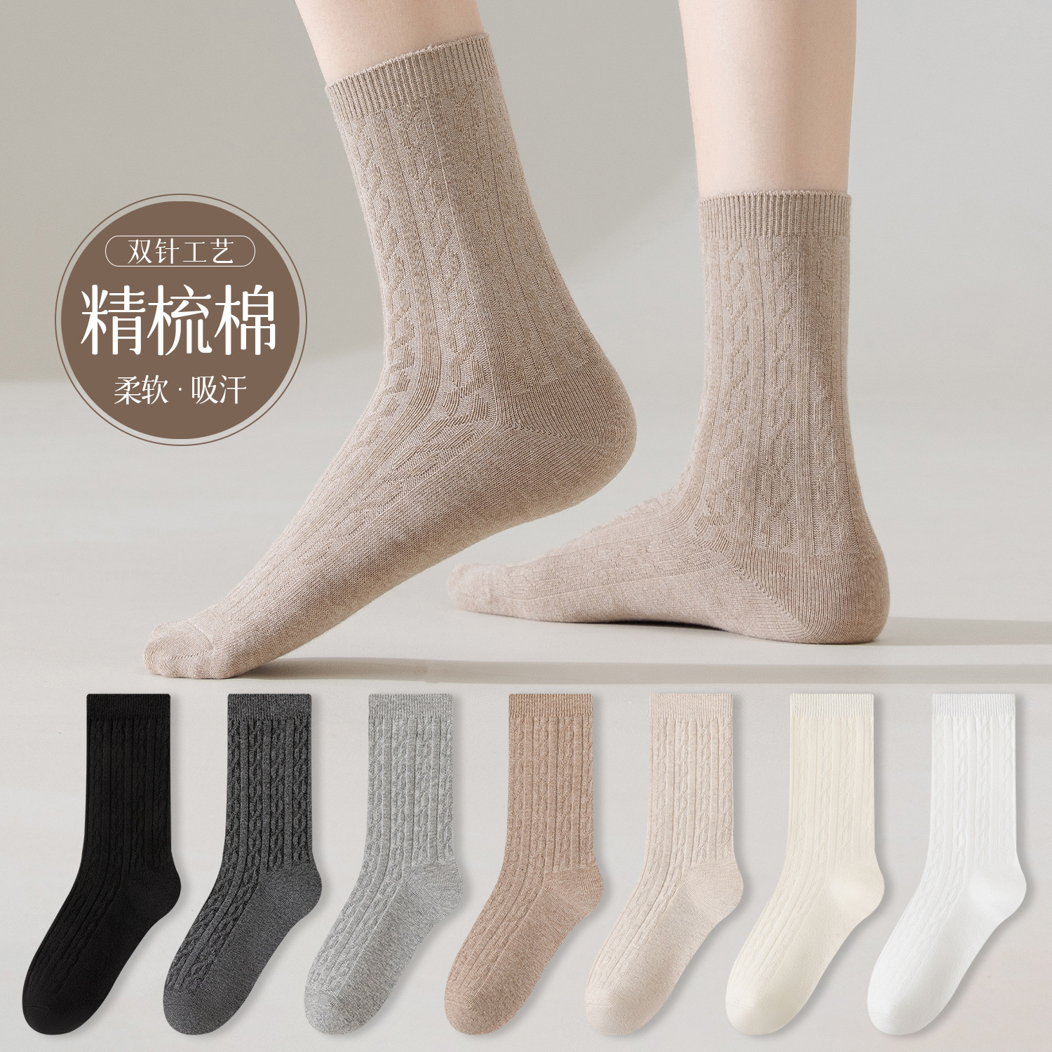 袜子女秋冬新款双针麻花中筒袜纯色无骨吸汗舒适百搭诸暨袜子批发