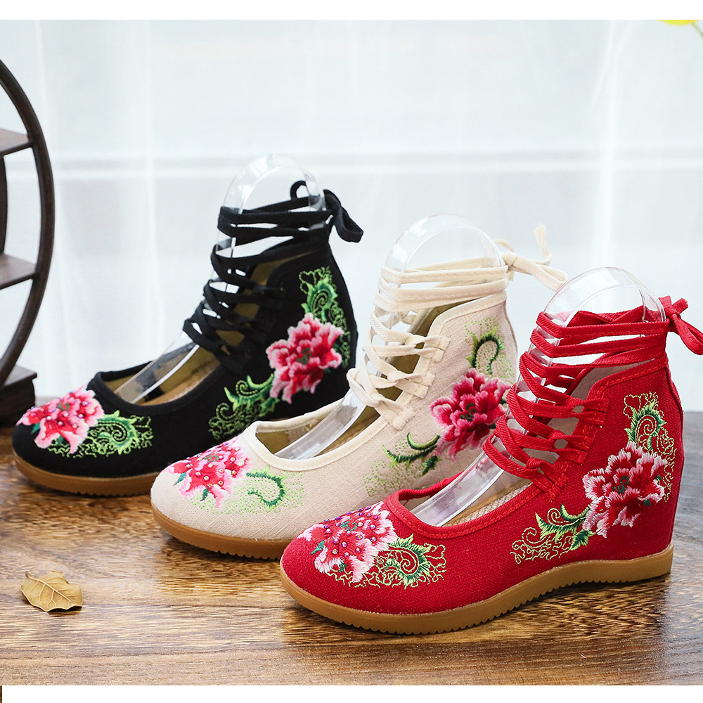 牛の筋肉の底の春秋の金のハイヒールの女性の靴の熱いドリルの刺繍の布の靴の坂と女性の刺繍の靴