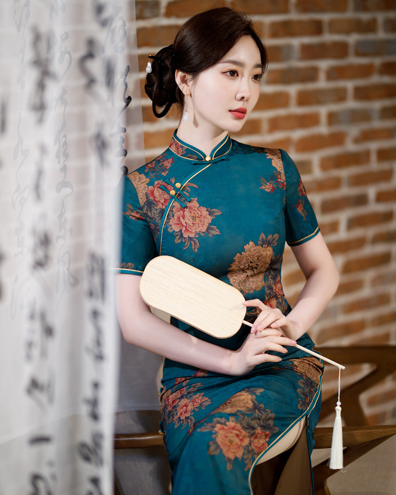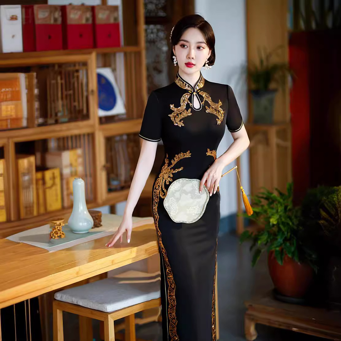 高級2025年旗袍、重厚なシルク、中華民国風旗袍、透け感のある魅惑的な旗袍、レトロなスリット入り旗袍、卸売対応