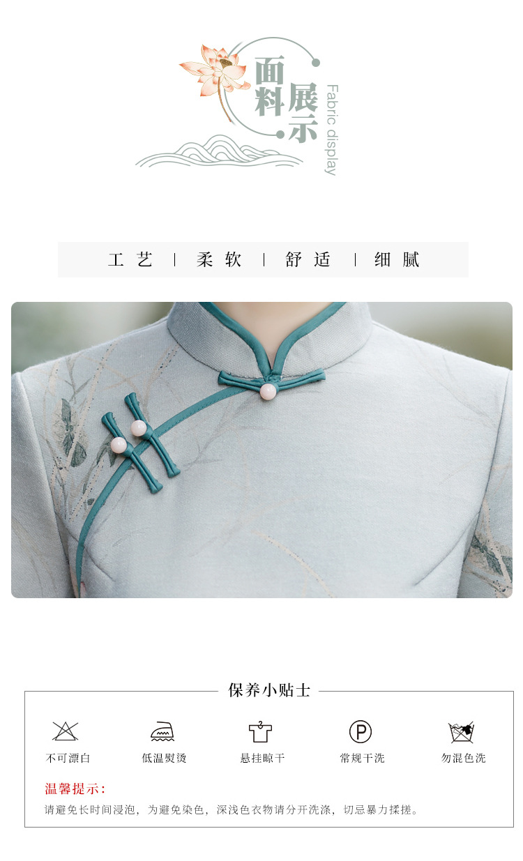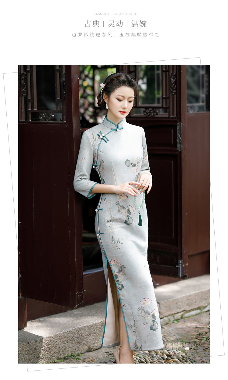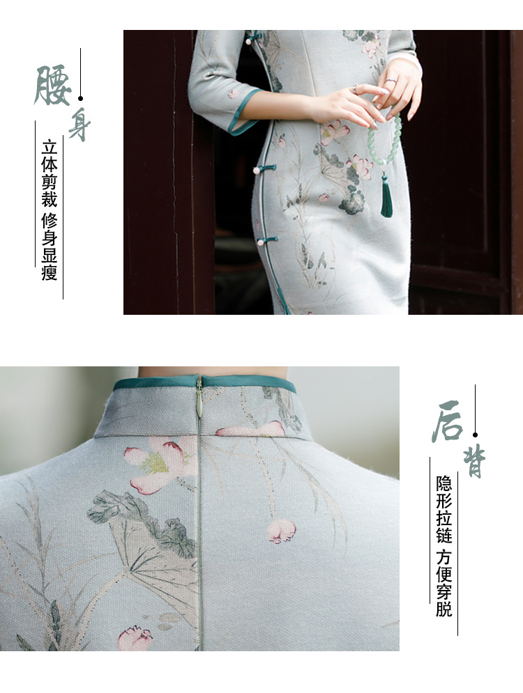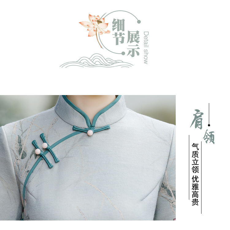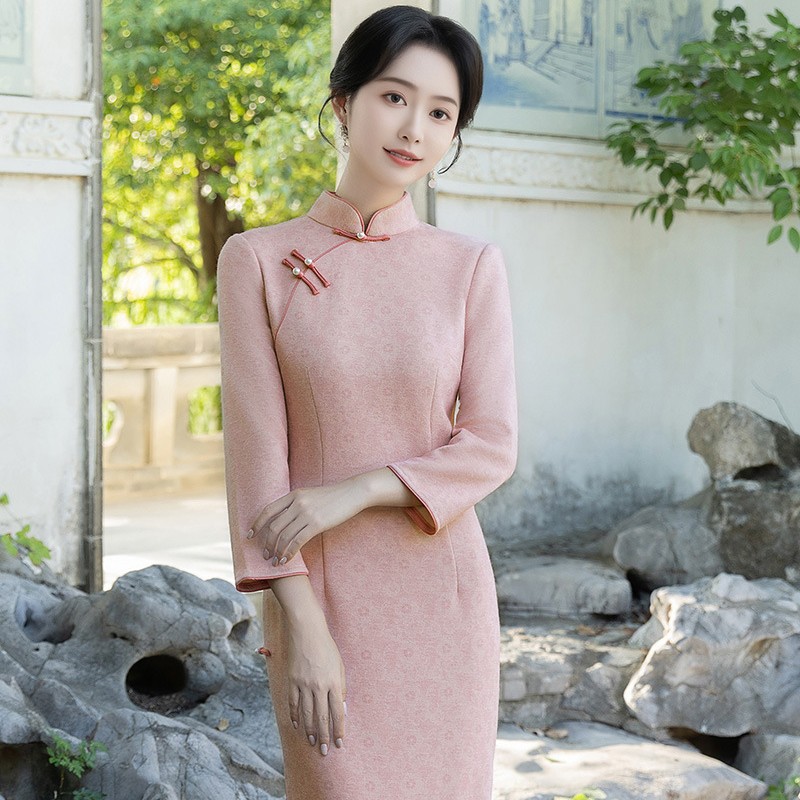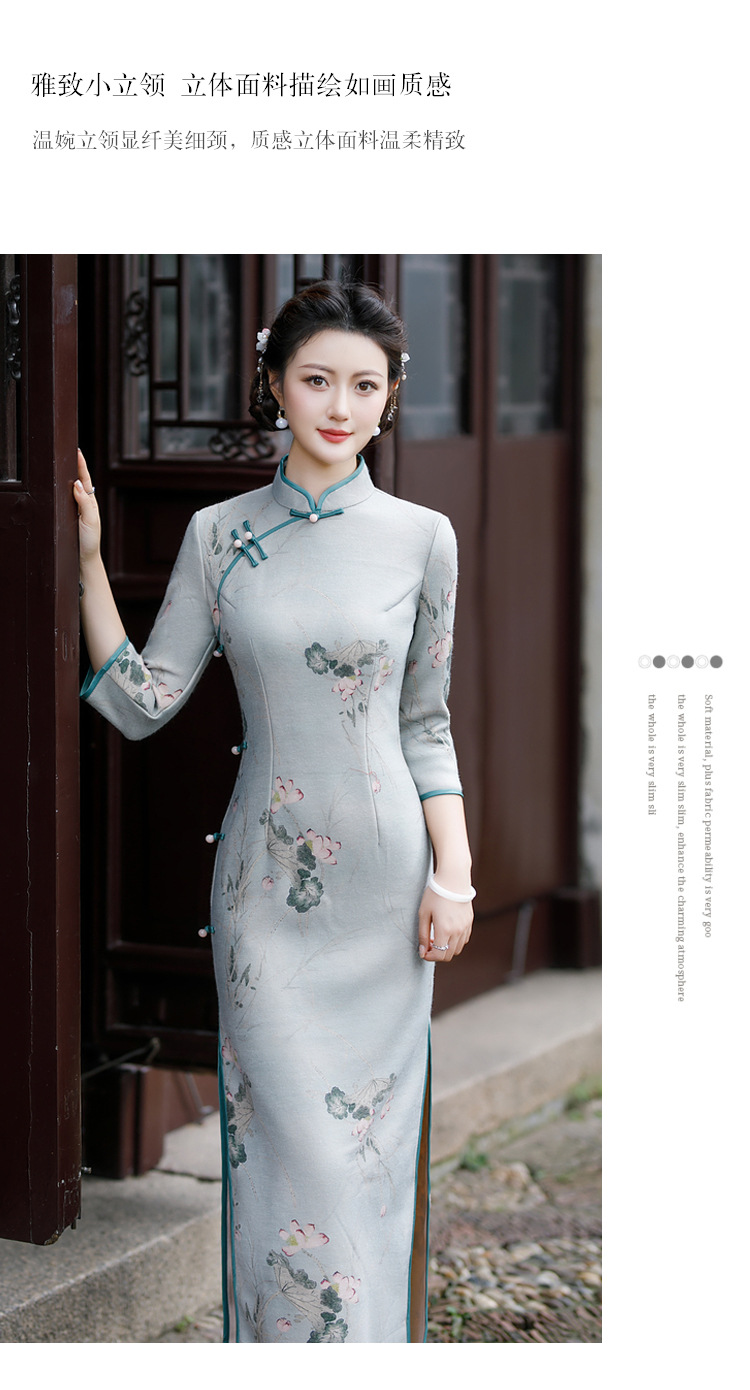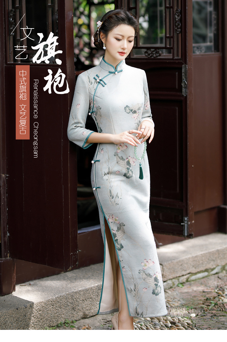 新中国式の国風のチャイナドレス秋冬の新型の中で、中国式のスタンドカラーのチャイナドレスの中で、スリットの雰囲気が優雅です。