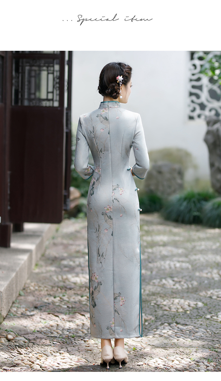 中国式のチャイナドレスのマンチェスターのプリントの長いタイプの立襟の秋冬はやせています。