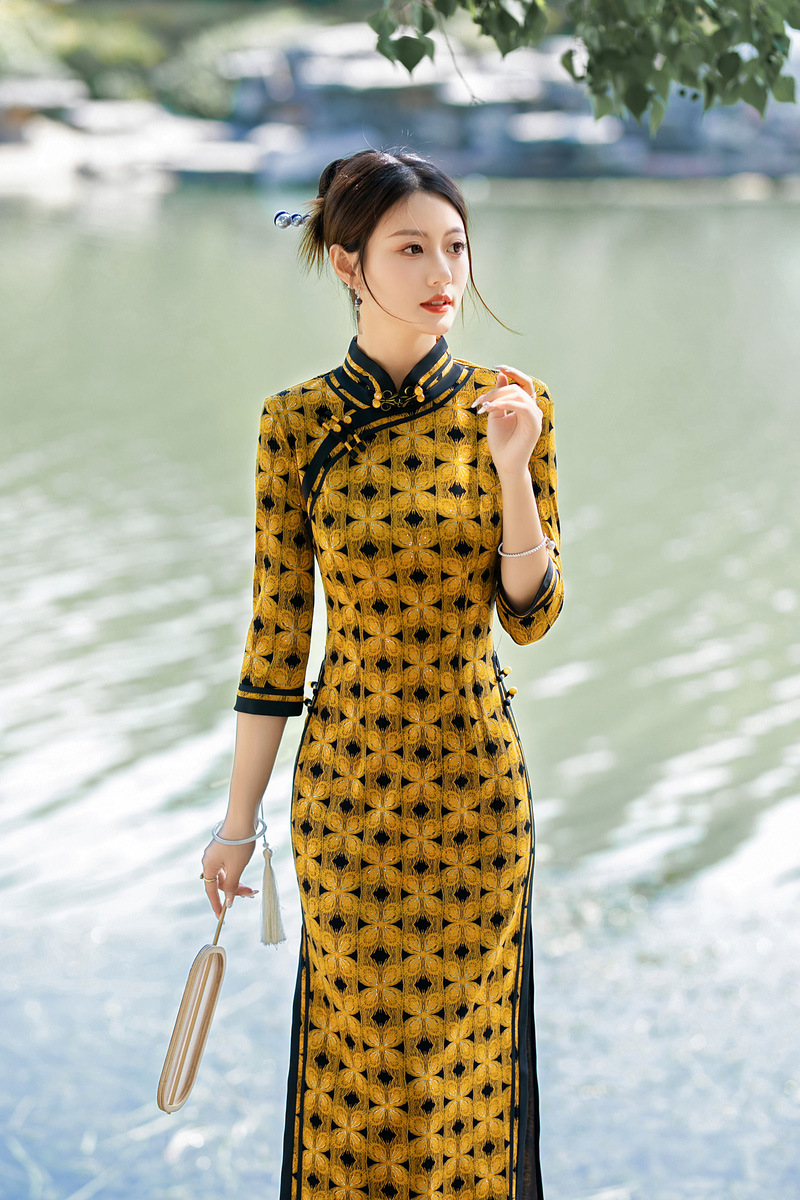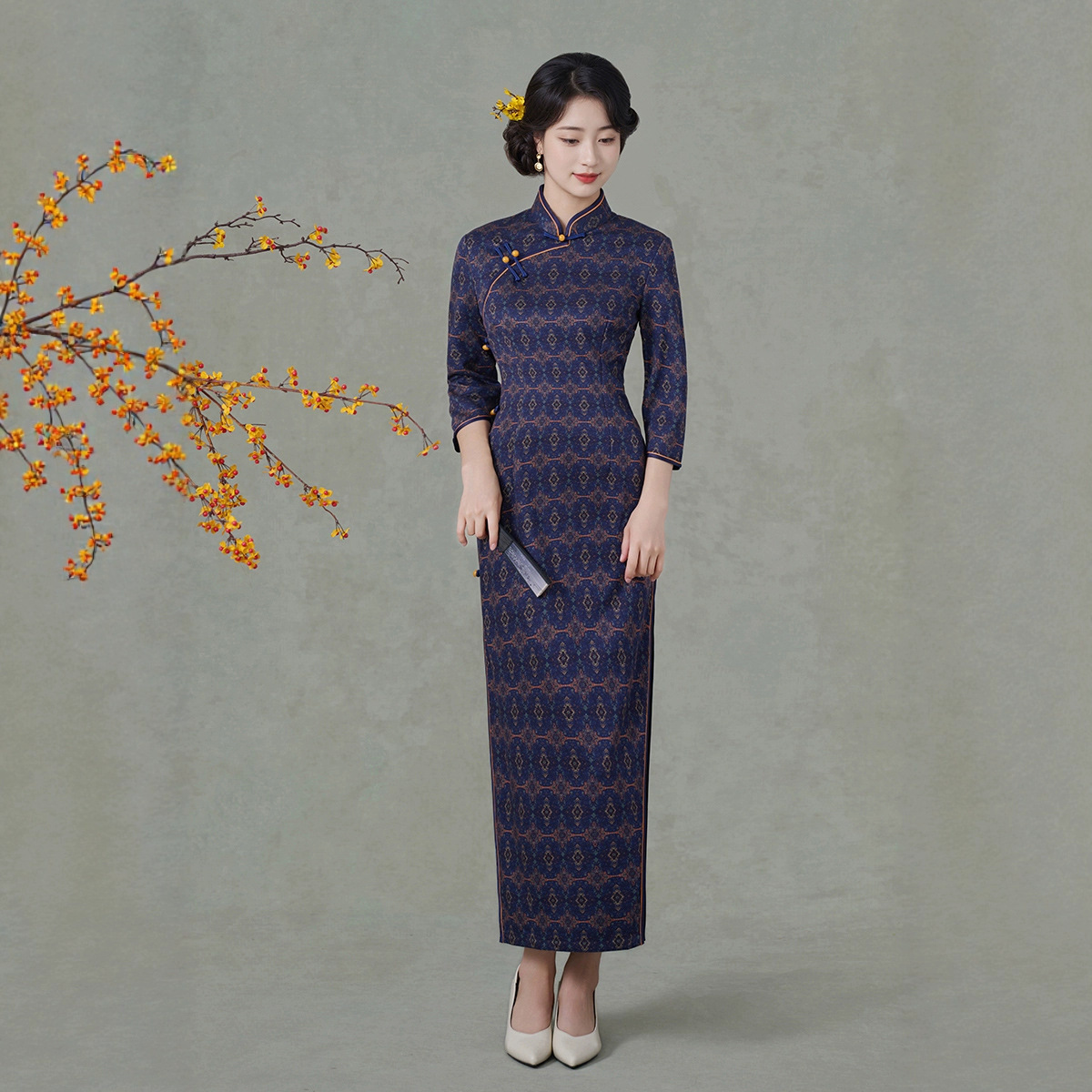 老上海風旗袍2025秋新作レディースレトロ気質ロングドレス七分袖改良版金糸ベルベット旗袍