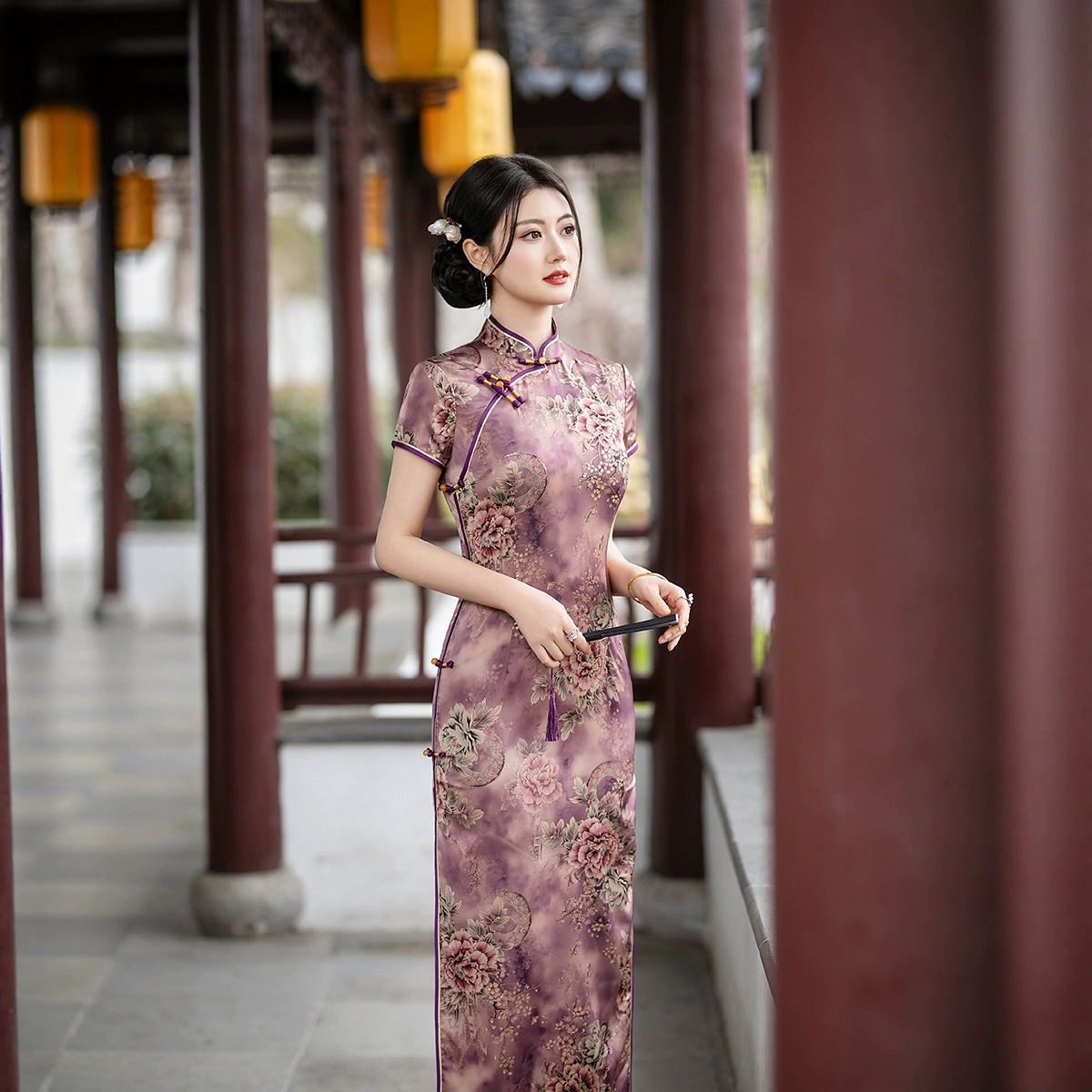ジャカード生地ロングチャイナドレス2025春文学レトロ中国風ママデイリーキャットウォークチャイナドレス