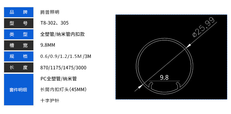 仕様 T8-302 0.6mフルプラスチックチューブ,T8-302 0.9mフルプラスチックチューブ,T8-302 1.2mフルプラスチックパイプ,T8-302 1.5mフルプラスチックパイプ,T8-305 0.6mナノチューブ,T8-305 0.9mナノチューブ,T8-305 1.2mナノチューブ,T8-305 1.5mナノチューブ