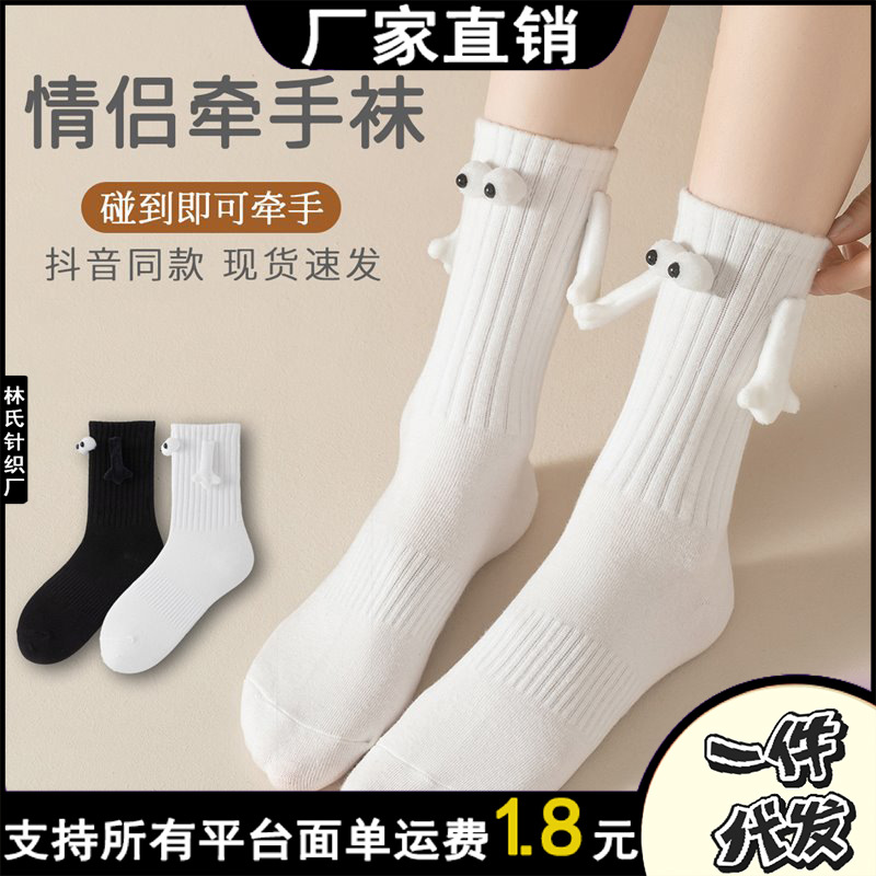 现货秒发磁吸情侣会牵手袜子纯色中筒袜潮流休闲闺蜜百搭防臭白色