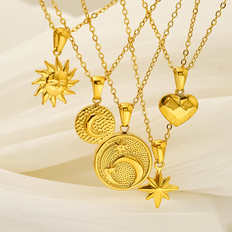 欧米風レトロスタイル太陽と月金メッキステンレスネックレス、色褪せなし、高級感、多用途チタン鋼ペンダント