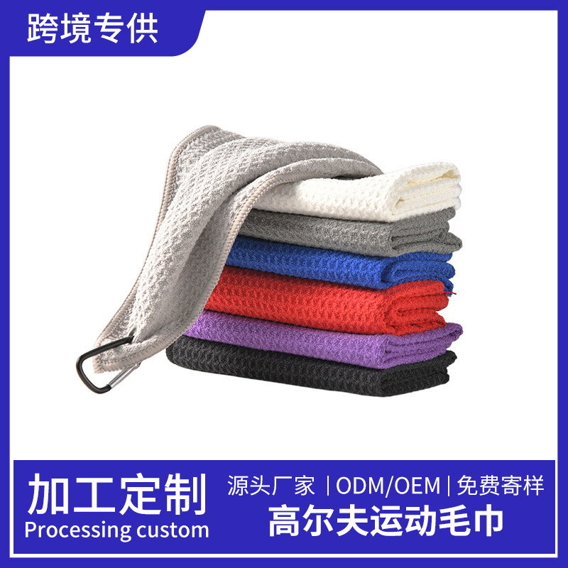 跨境菠萝格登山扣高尔夫杆巾超细纤维便携华夫格刺绣清洁运动毛巾