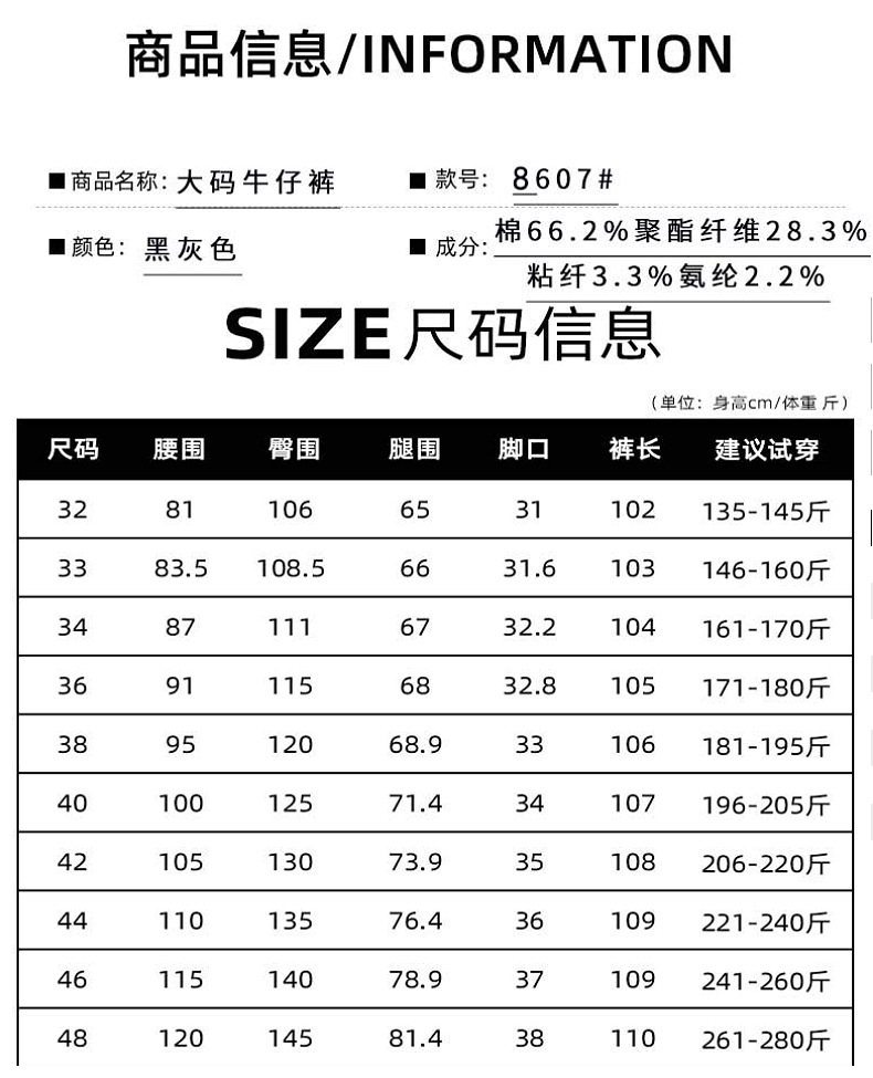 ズボンサイズ 32推奨 (130-150)斤,33提案 (150-160)斤,34提案 (160-170)斤,36提案 (170-180)斤,38提案 (180-200)斤,40アドバイス (200-220)斤,42提案 (220-240)斤,44提案 (240-260)斤,46提案 (260-280)斤,48アドバイス (280-300)斤