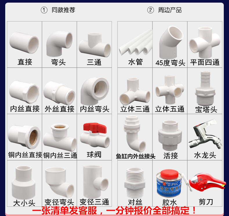 製品仕様 20pvc(4点),25pvc(6点),32pvc(1インチ),40pvc(1.2インチ),50pvc(1.5インチ),63pvc(2インチ),75pvc(2.5インチ),90pvc(3インチ),110pvc(4インチ)