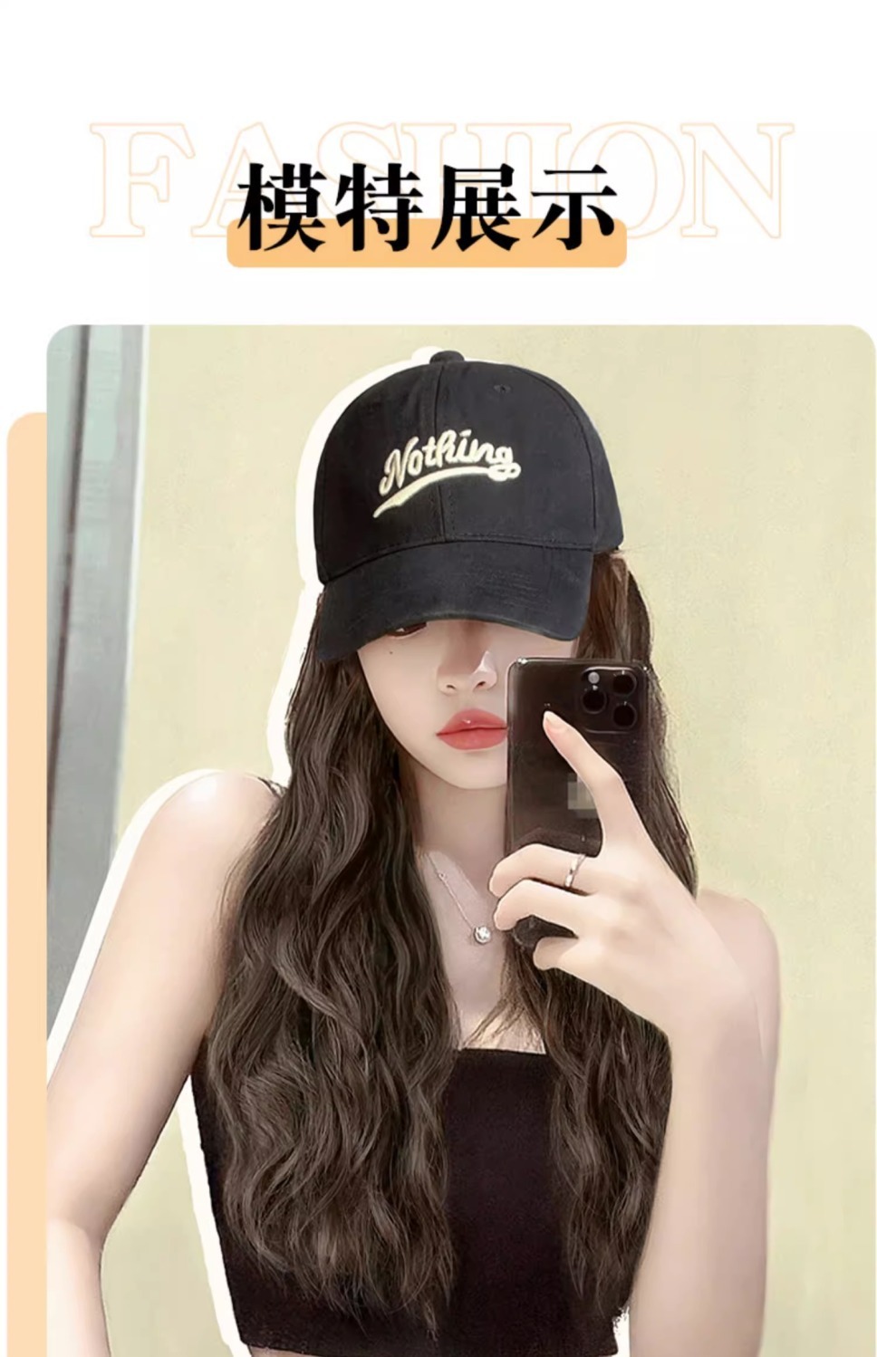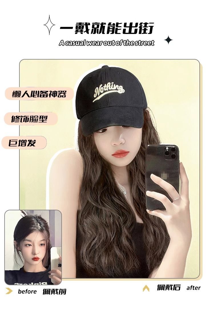 No野球の帽子のかつらの女性のウールの巻きの新型の韓国版の大きい頭は顔の小さい水の波紋の一体のかつらの帽子を現します。