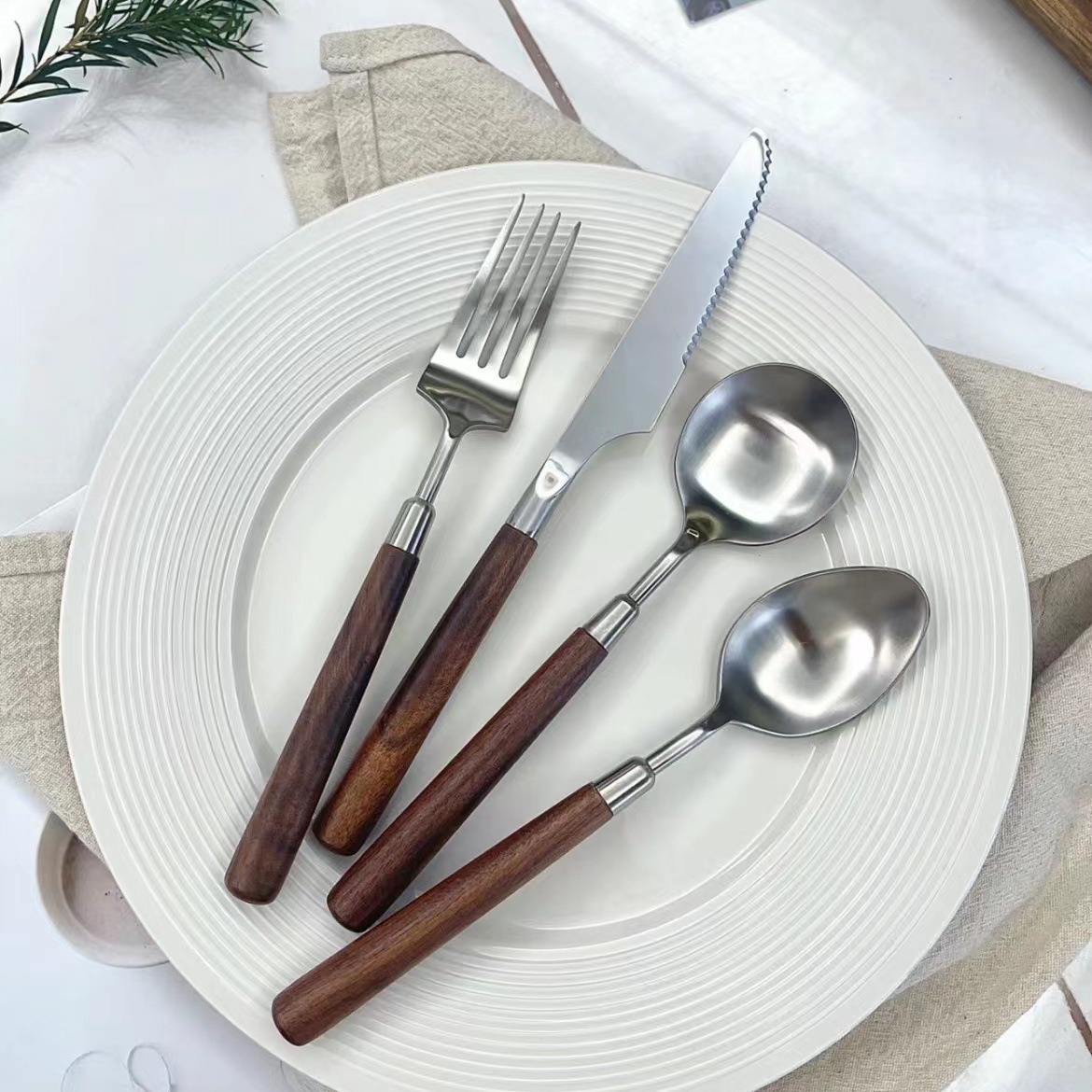 胡桃木304ナイフフォークスプーンレトロ木柄ステンレス食器4点セットスプーンナイフフォークレストランホテル