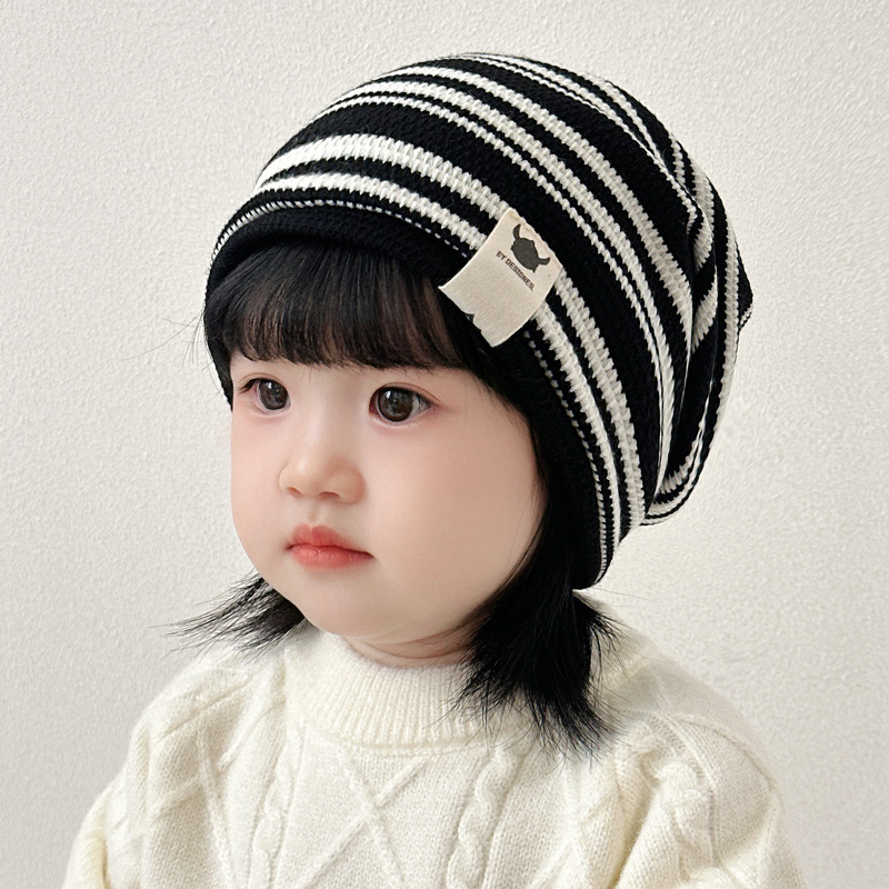 韩版儿童帽子秋冬季宝宝条纹针织帽男女童防风保暖护耳双层套头帽