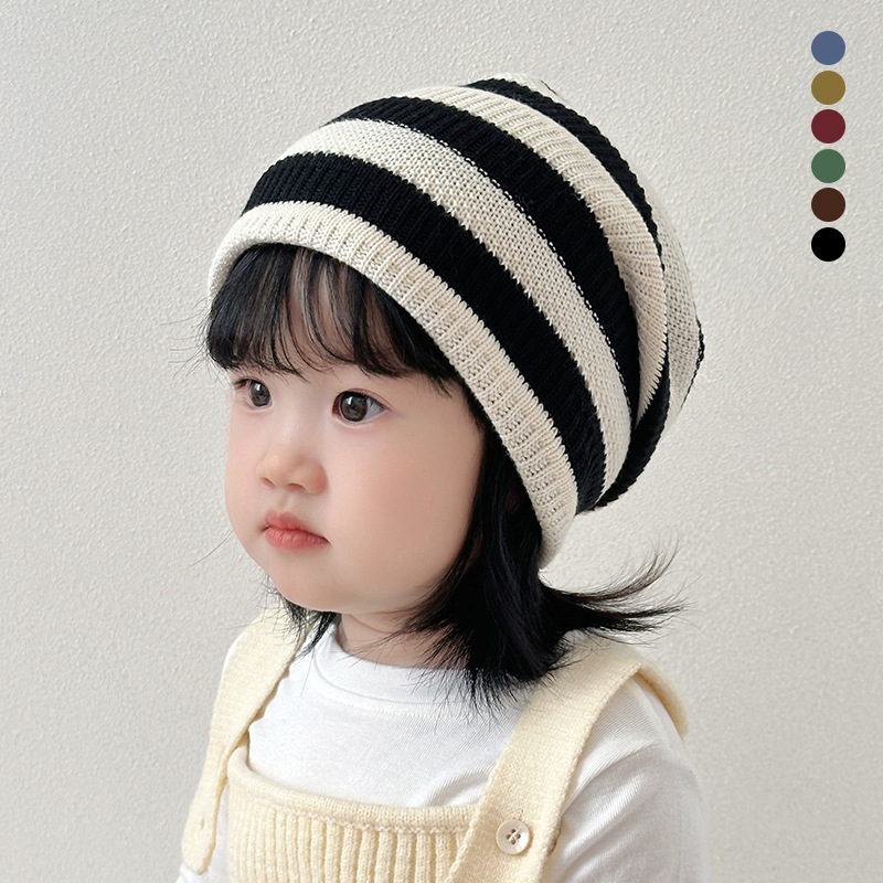 2025新款儿童帽子撞色可翻边戴男女童套头帽宝宝秋冬季保暖条纹帽