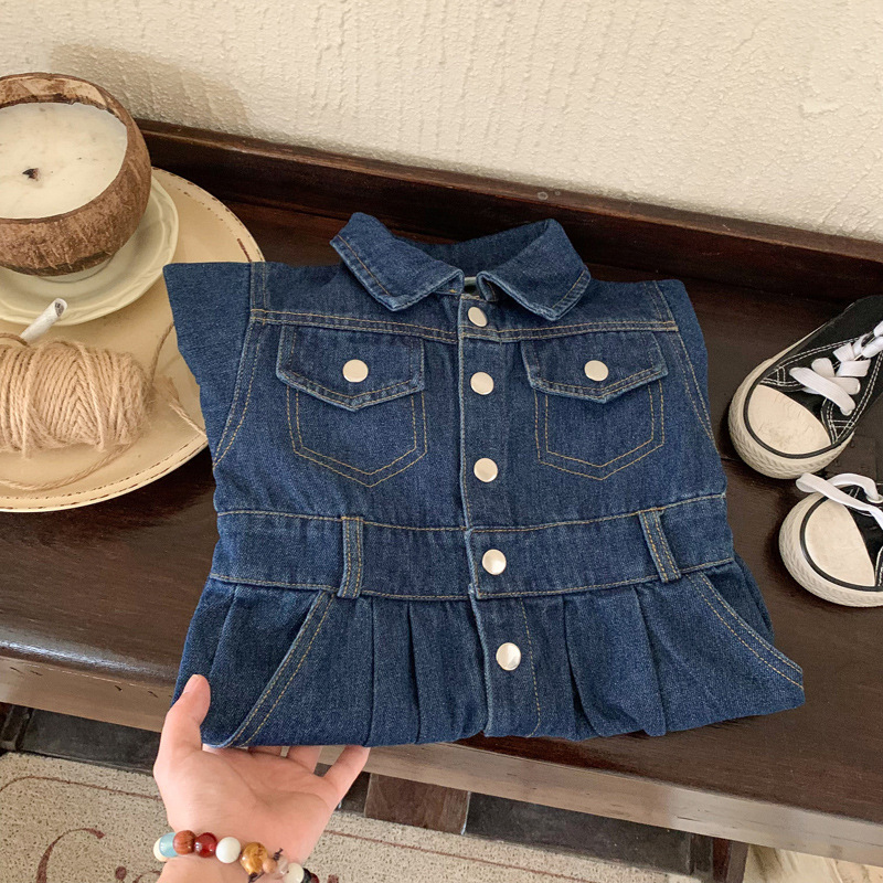 韓国の春の新型の女性の赤ちゃんの洋気のデニムのスカートの中で子供の赤ちゃんは服を着て襟をひっくり返します。