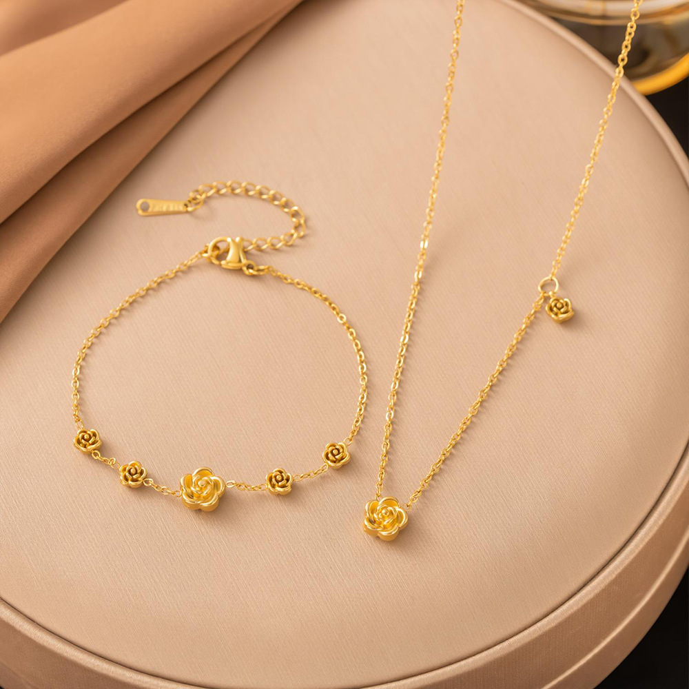 跨境热销18k金色不褪色钛钢玫瑰花首饰套装小众花卉锁骨链项饰女