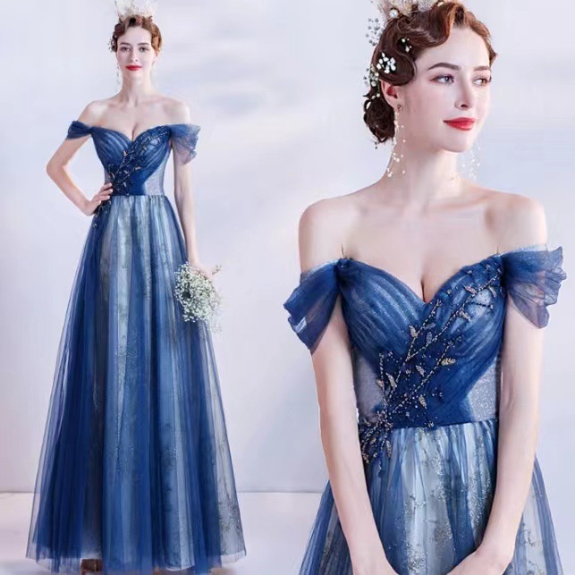 ワンショルダーイブニングドレス 2025 ヘイズブルーピアノ演奏成人式ウェディングドレスソプラノソロブルーガーゼスカート芸術試験
