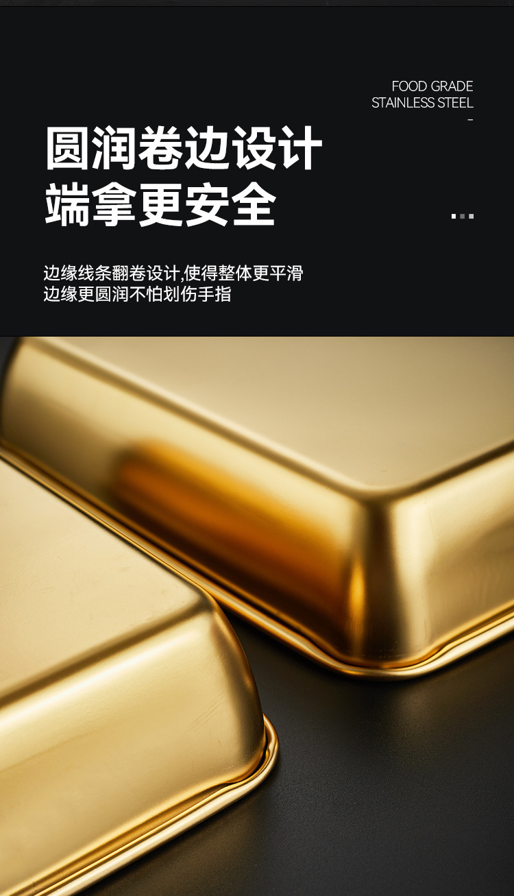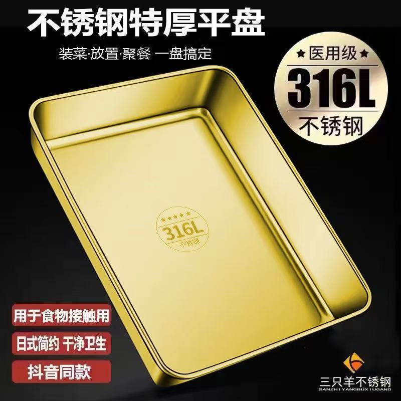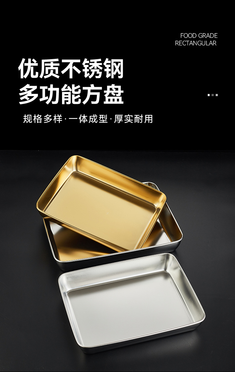 316不锈钢加厚金色不锈钢方盘长方形托盘平底窄边展示方盘烤肉盘