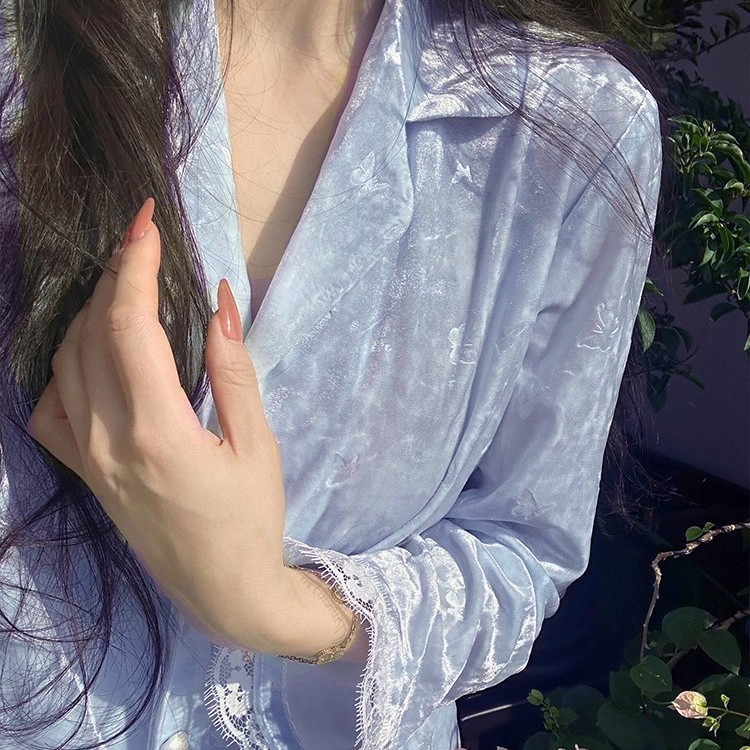 青い華奔春と秋の新商品の国風の金のドリルのパジャマの女性は長袖の金のベルベットの家庭服のスーツの秋冬を厚くします。