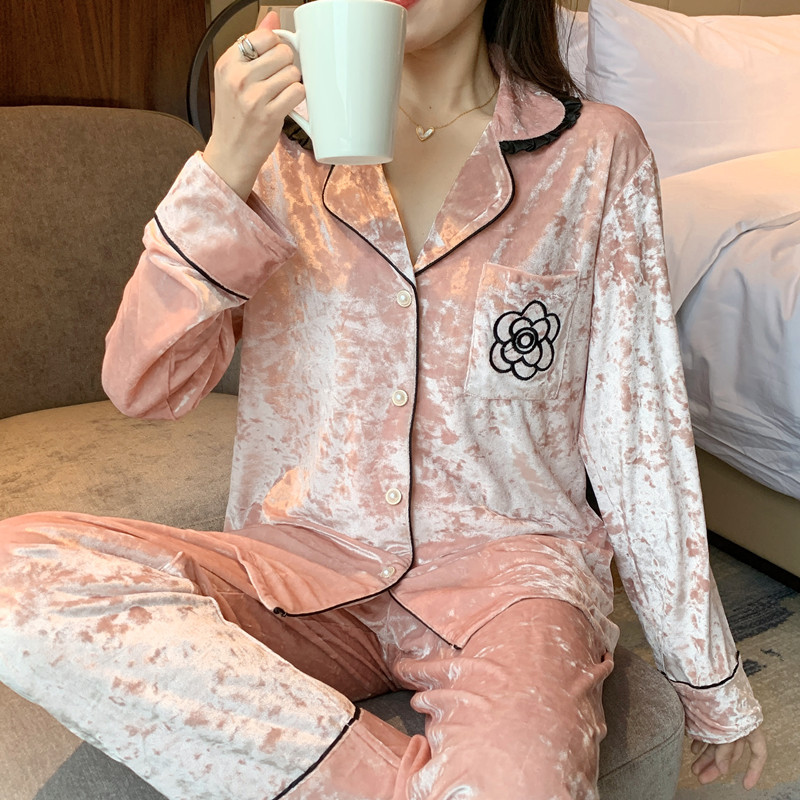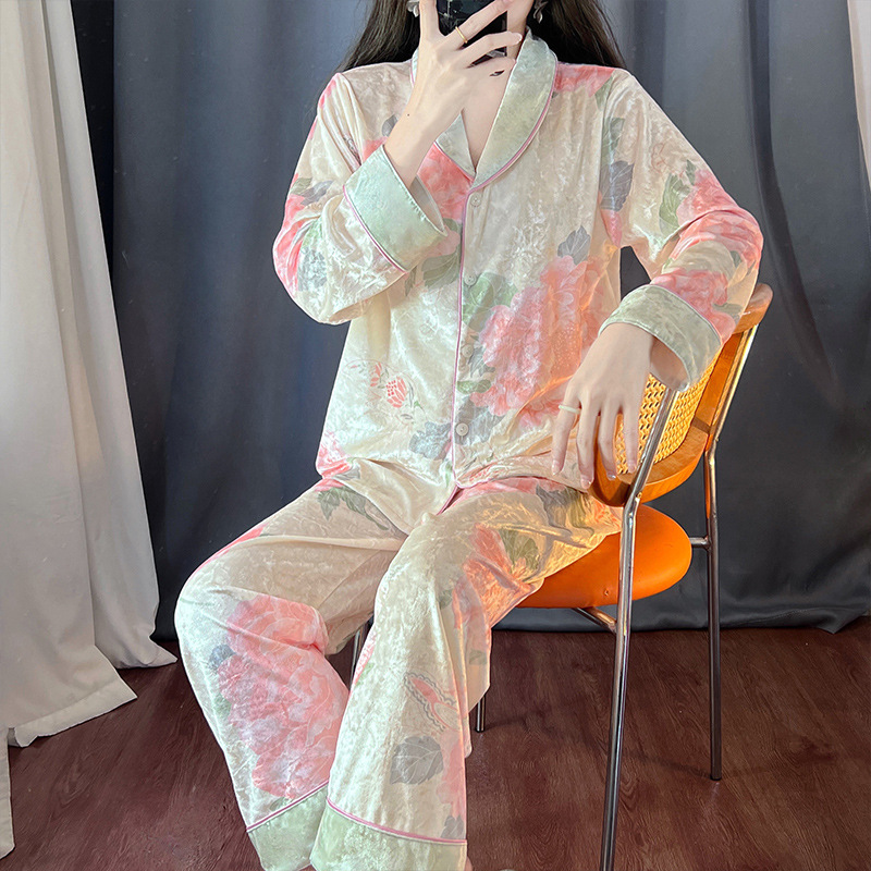生放送で起爆した秋冬金ドリルパジャマ女カーディガン牡丹花高級感金ベルベット保温家庭服セット