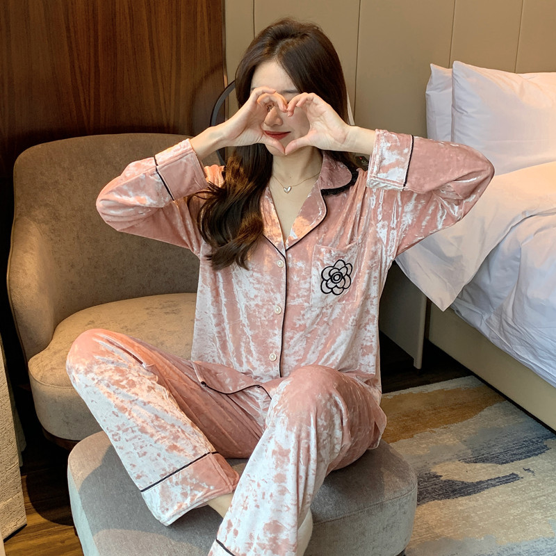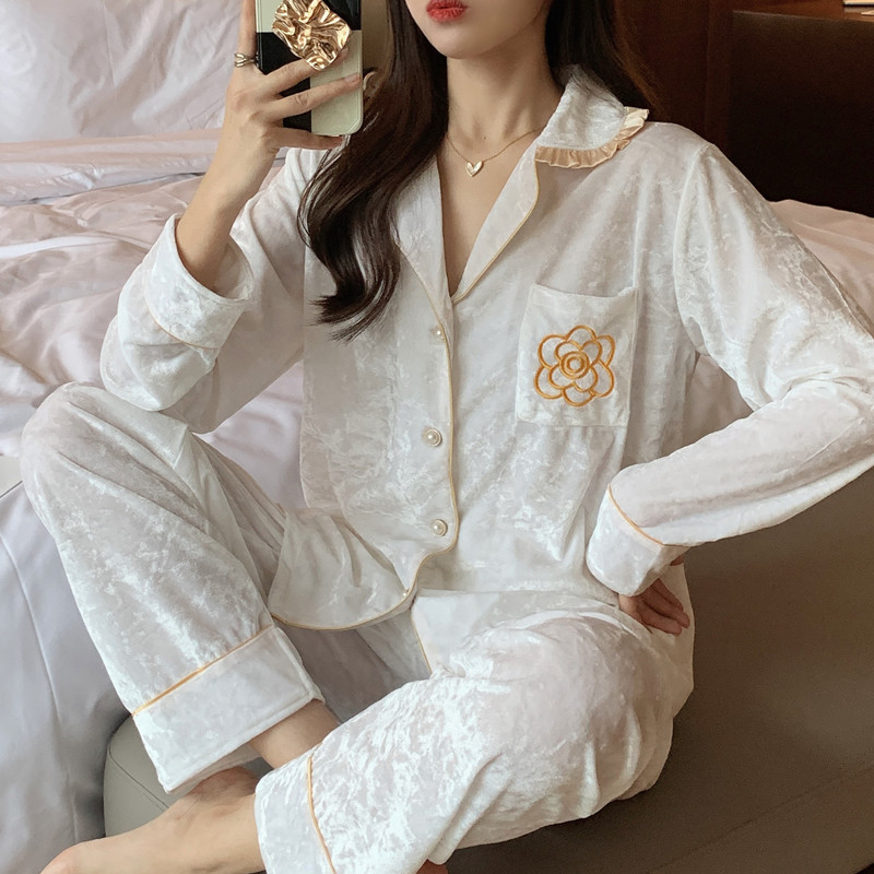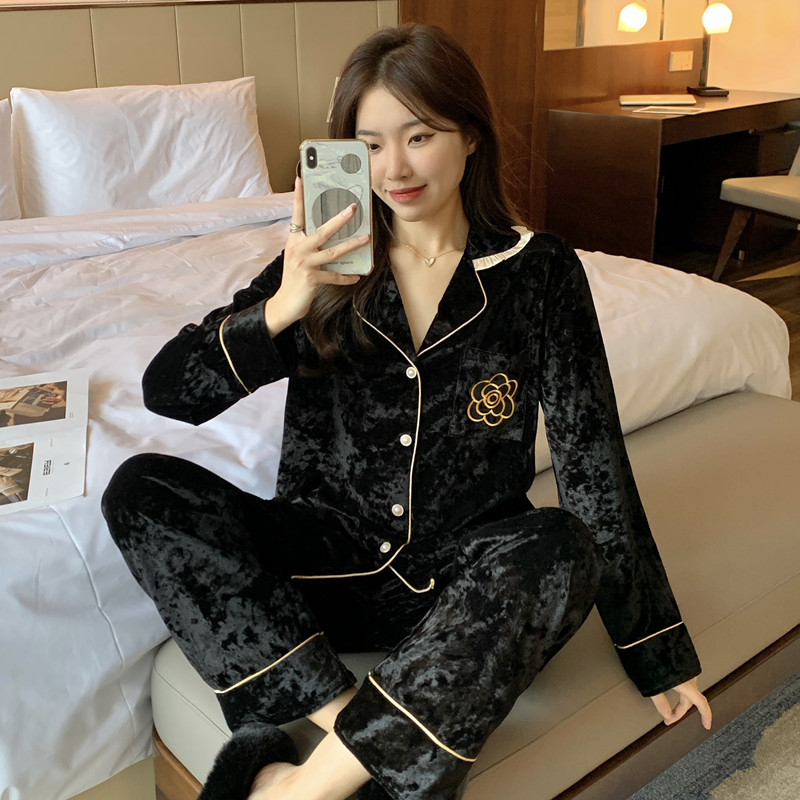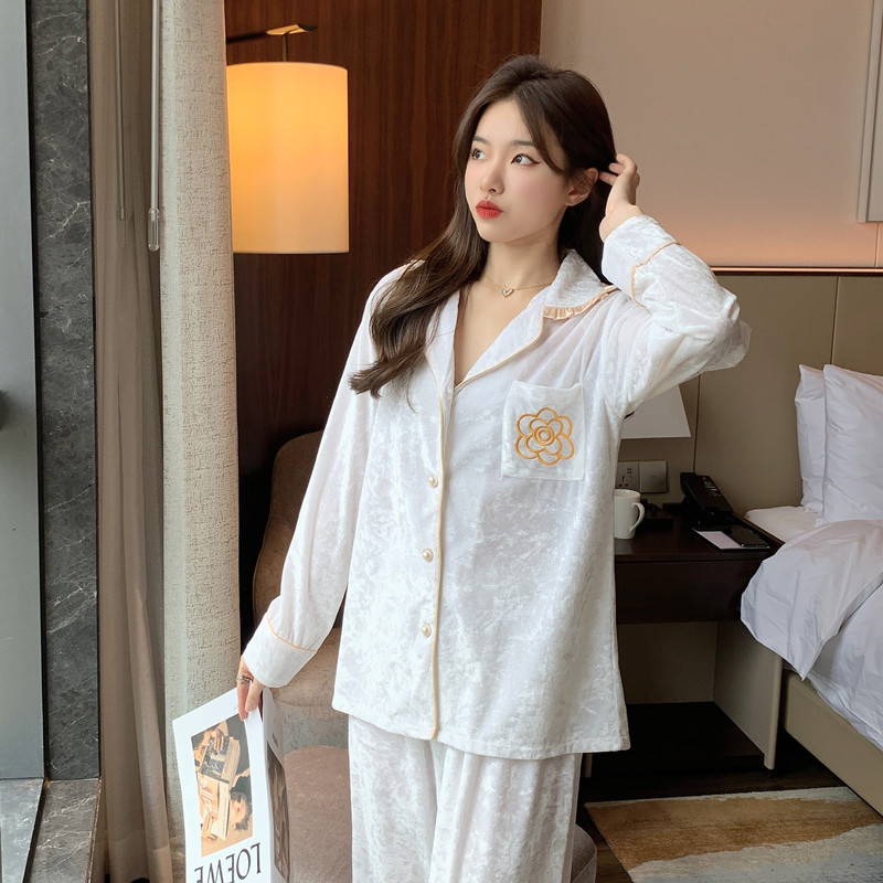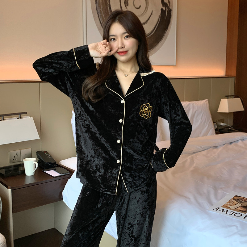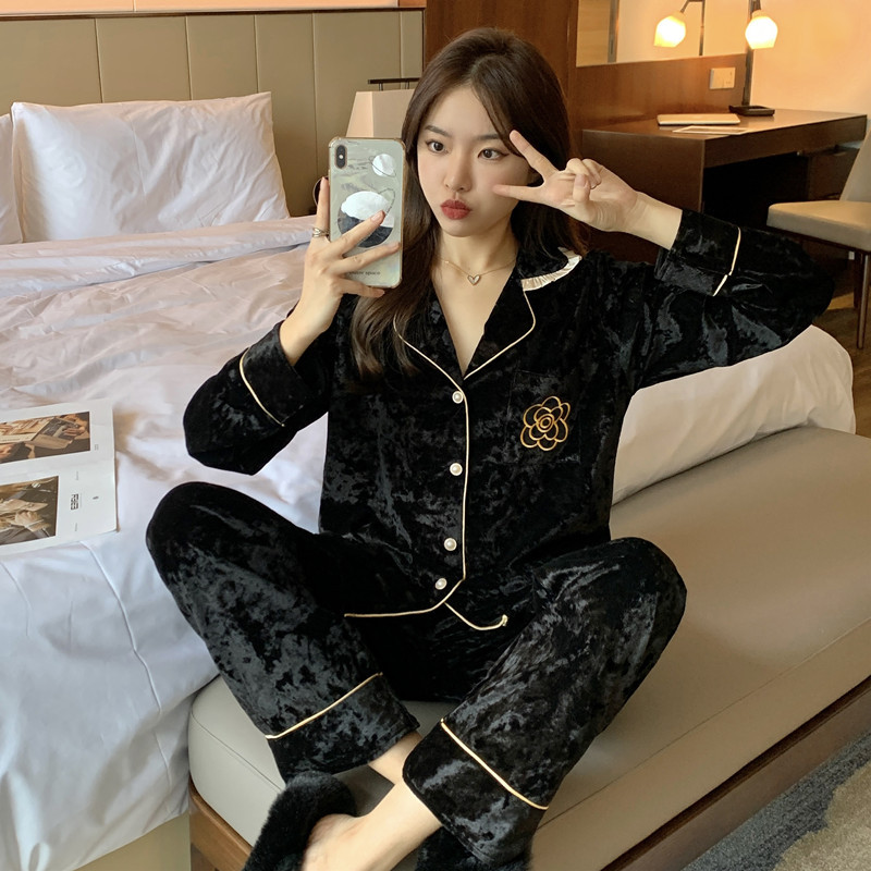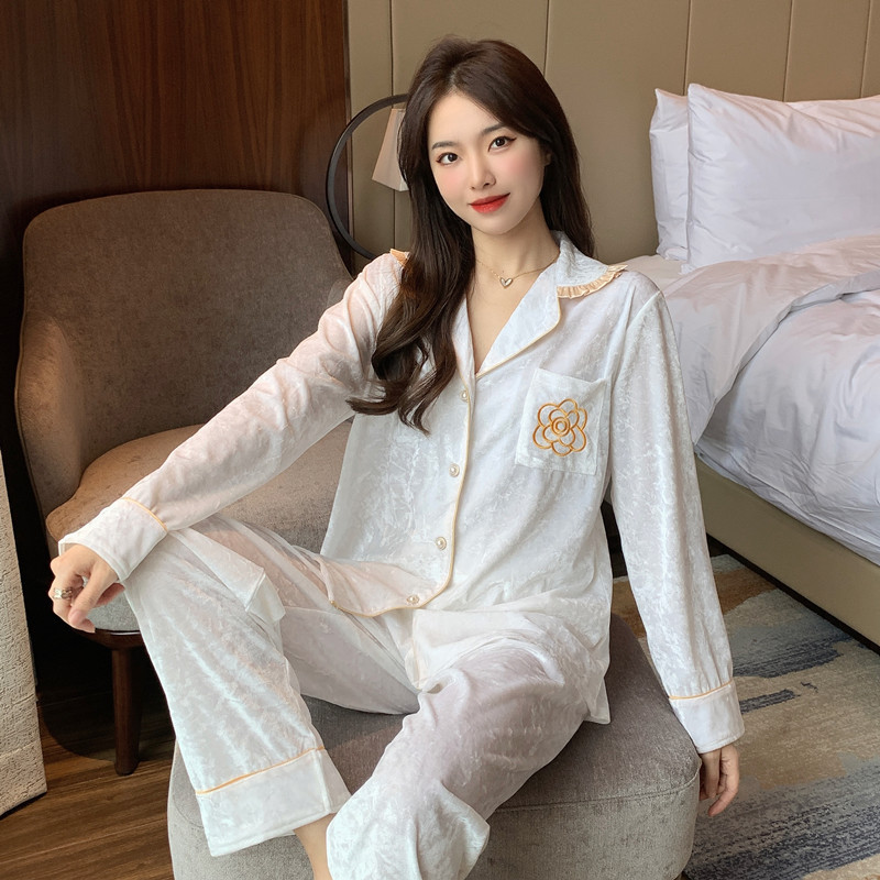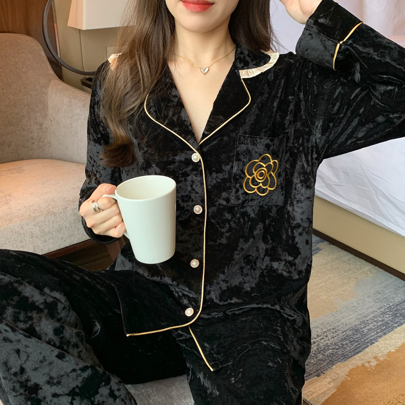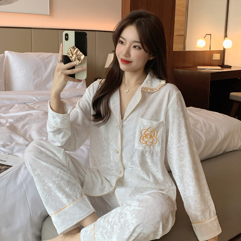フランス風ゴールドベルベット甘いフレアスリーブ秋冬新作ソフトゴールドダイヤモンドベルベット暖かいホームウェアセットパジャマ女性用