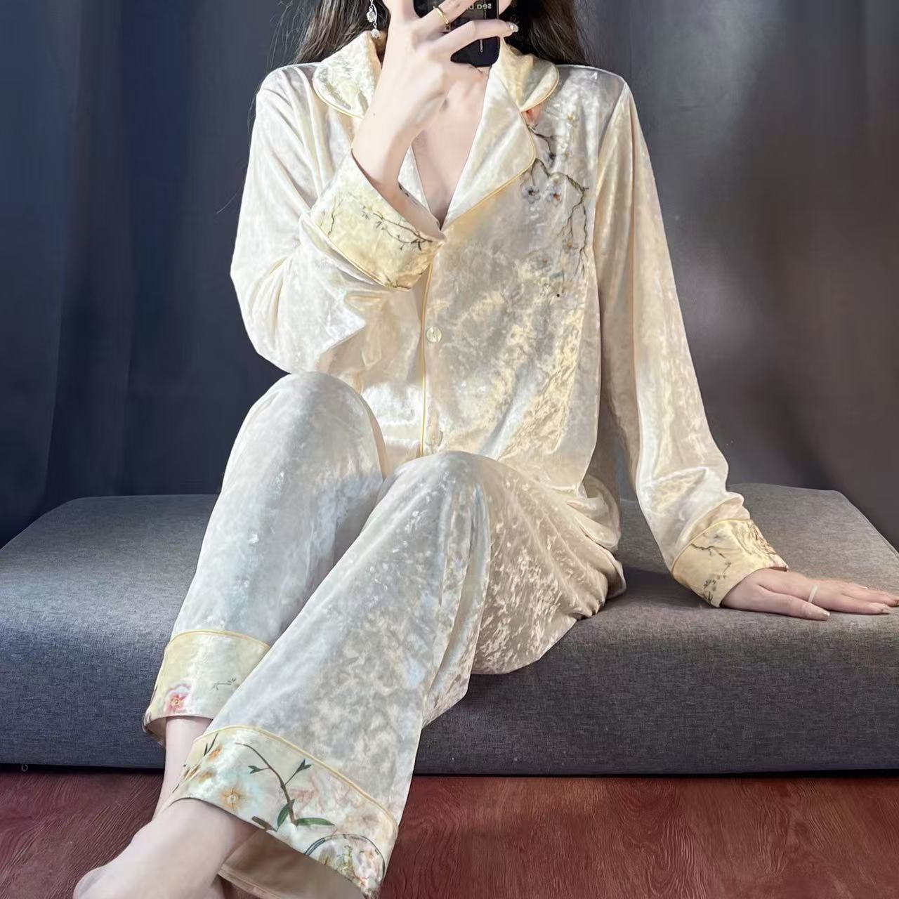 金糸ベルベットパジャマ レディース 秋冬新作 高級感 新中式 国風 長袖 保温 外出着 ホームウェアセット