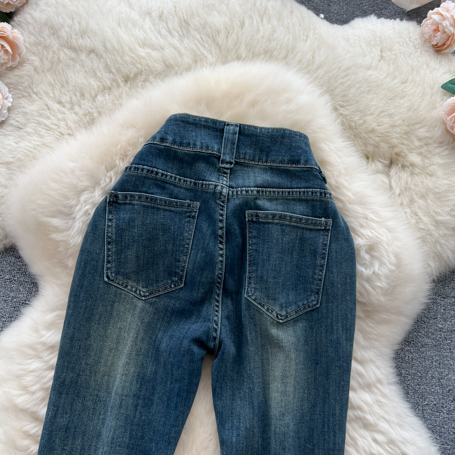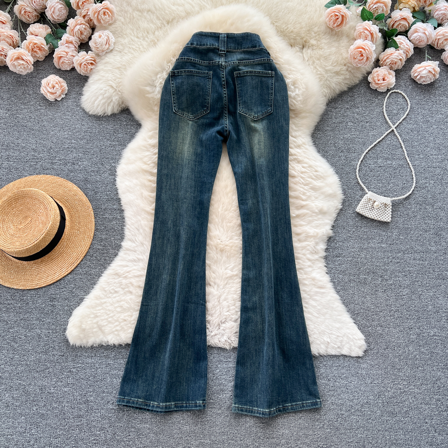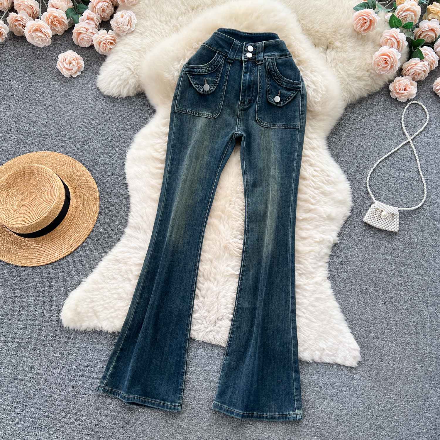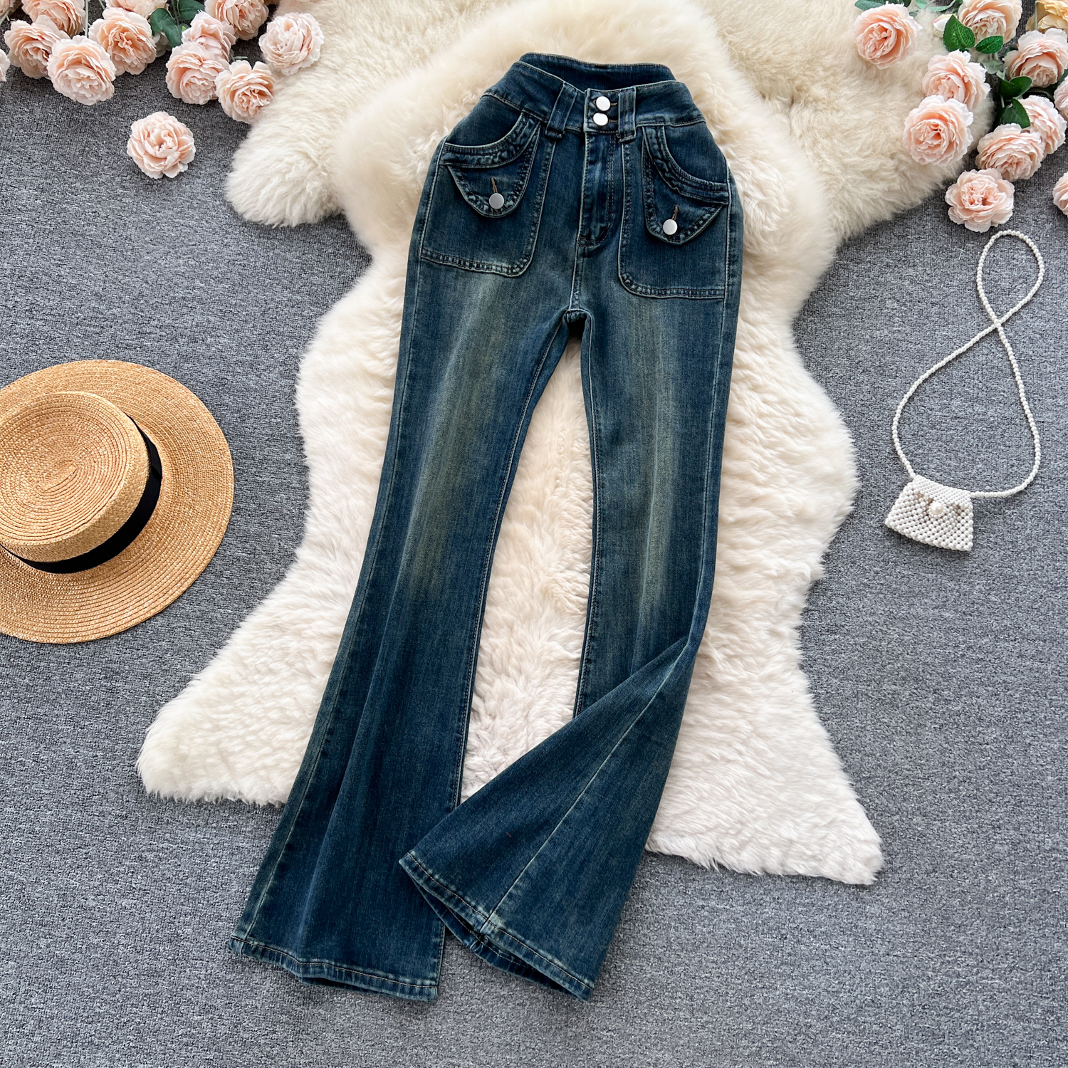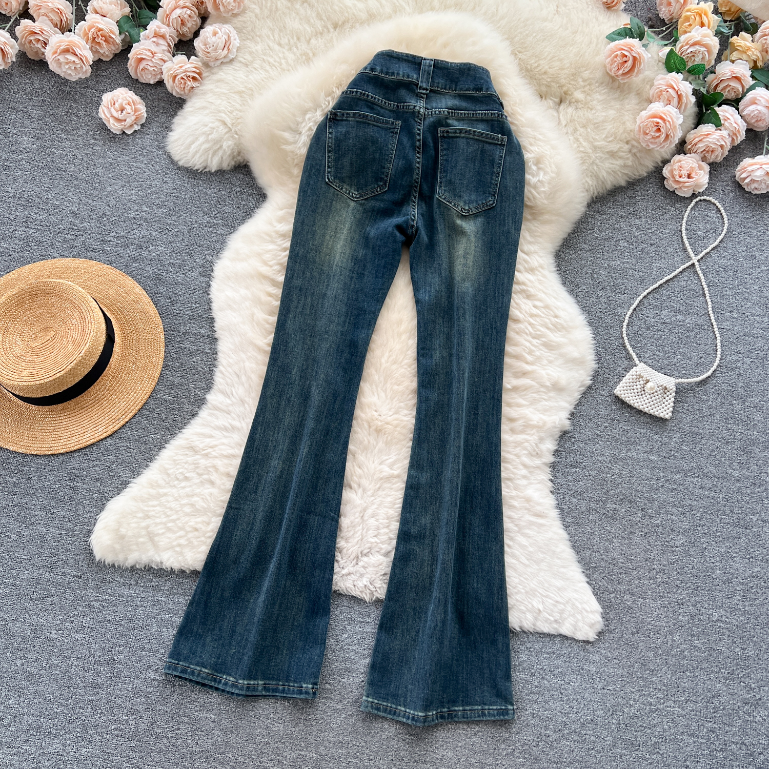 甘いギャルの復古的な高腰の小さいラッパのジーパンの女性の早秋の新型の小さい大衆の設計感は身を修めるのがやせていることを示しています。
