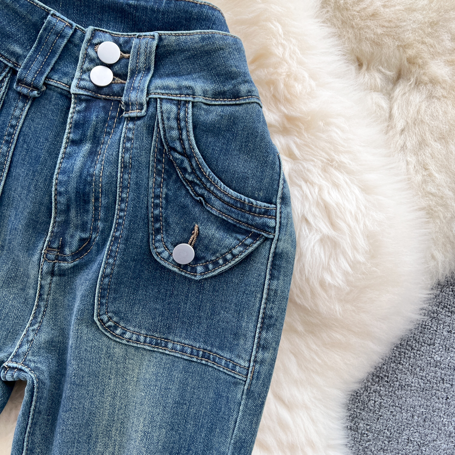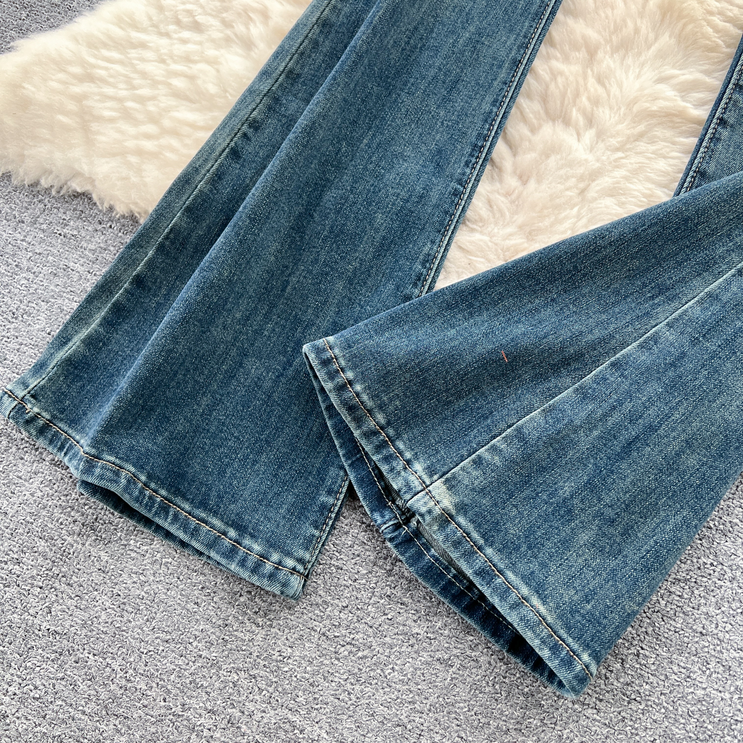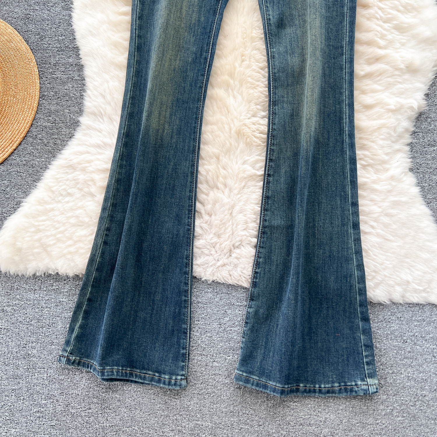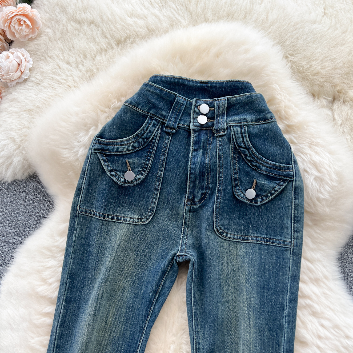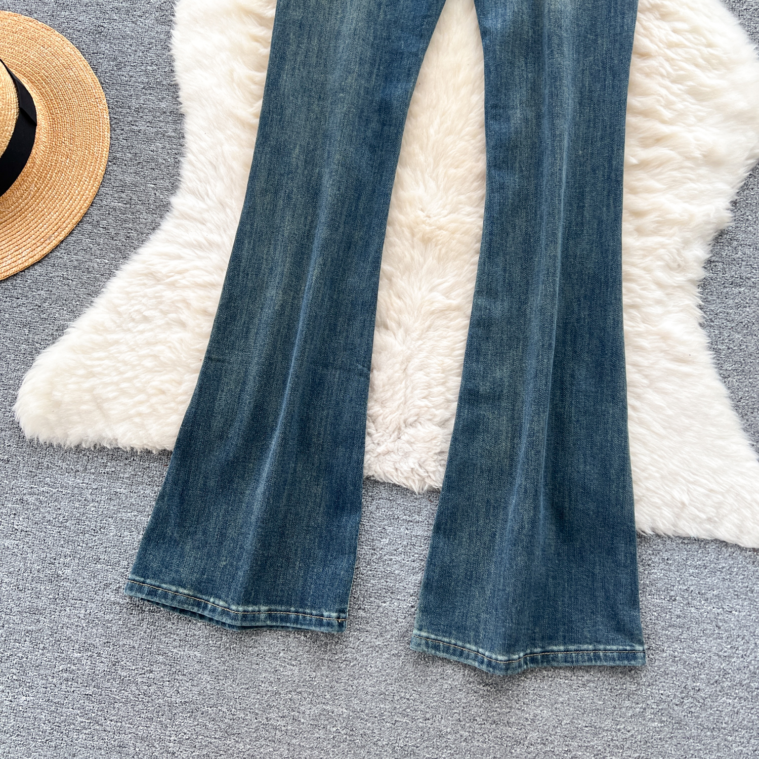 甘いギャルの復古的な高腰の小さいラッパのジーパンの女性の早秋の新型の小さい大衆の設計感は身を修めるのがやせていることを示しています。