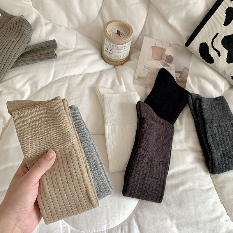 原宿風日本式太線靴下女性秋冬ファッションと布マークの中筒靴下シンプルな縦紋純色のスタッキングソックス