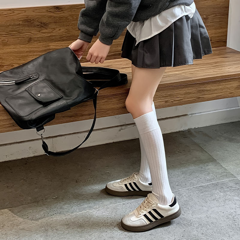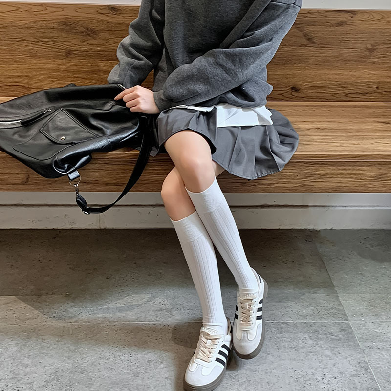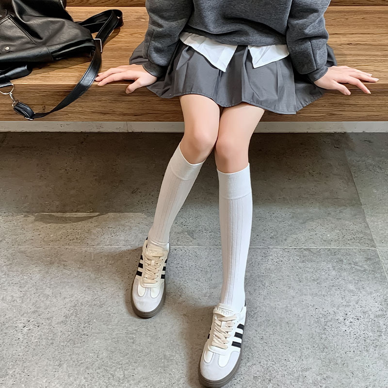 日本製 JK スタイルの女性用白カーフソックス、トレンディな春夏のアウターウェア、シンプルで多用途な縦縞の痩身ストッキング