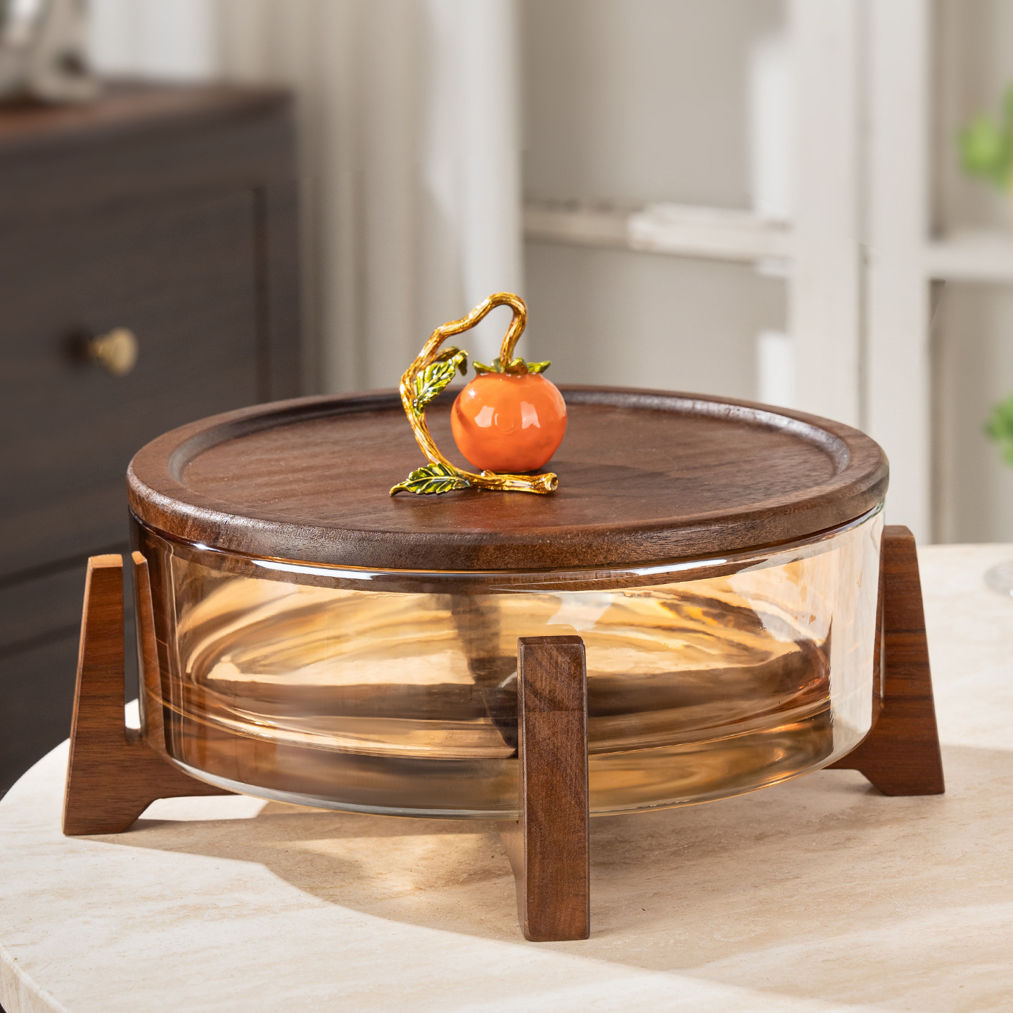 家庭用リビングルームのお茶の果物皿は軽くて高級な実木の果物箱のスナック皿の新型のガラスのキャンディーの収納箱です。